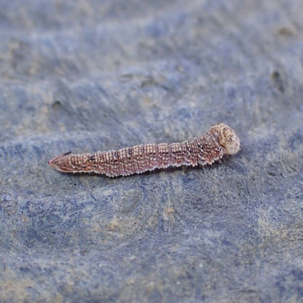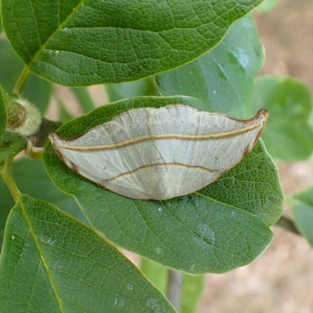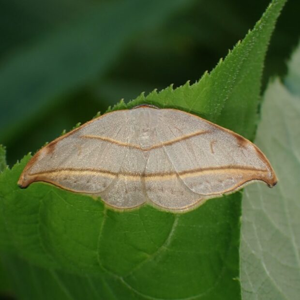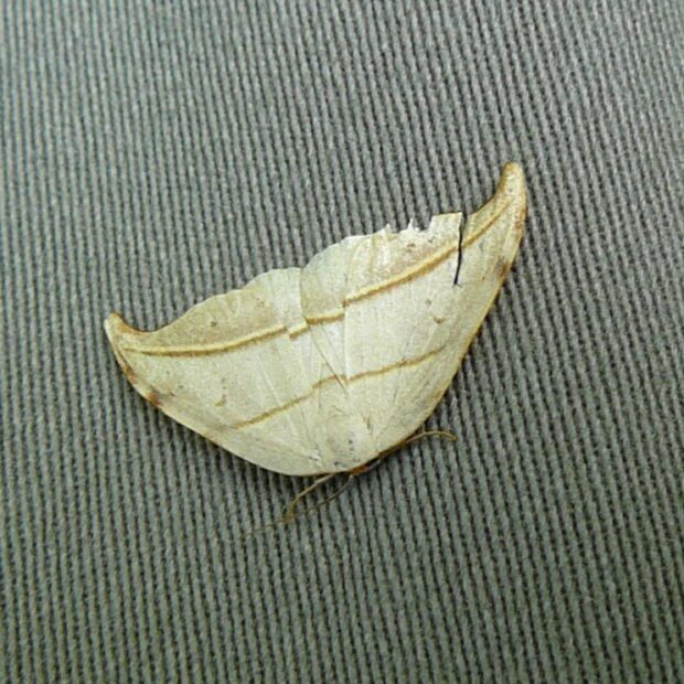 平地から山で普通に見られるカギバガの仲間。 カギバガにふさわしく、 かぎ状にとがった前ばねが目立ちます。 2本の横線があるクリーム色のはねが特徴。 夜行性で明かりにやって来ます。 蛹越冬。