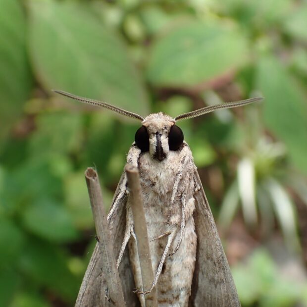 腹部に黒、 ピンク、 白のシマがあるスズメガの仲間。 スズメガ科の中でも特に長い口吻(約10cm)を持ち、 日が暮れると花にやって来ます。 幼虫はヒルガオ科植物を食べ、 体色は褐色~緑色で、 変化に富みます。 サツマイモ畑の土の中からよく蛹が見つかります。