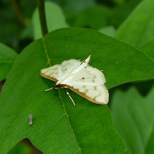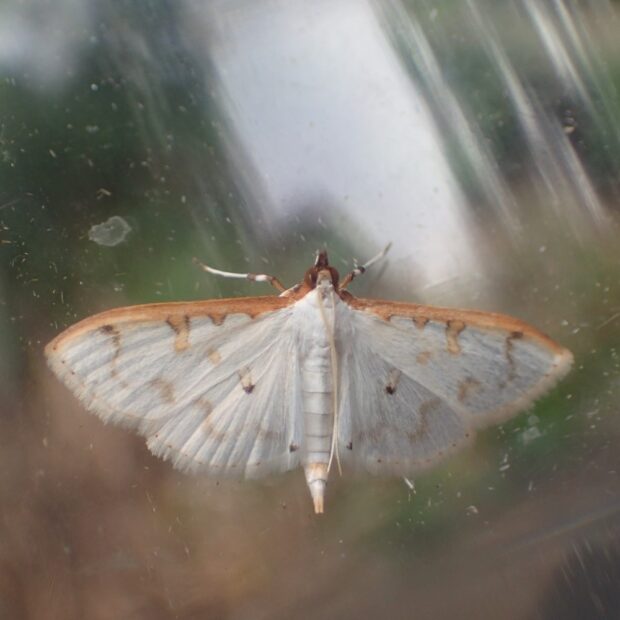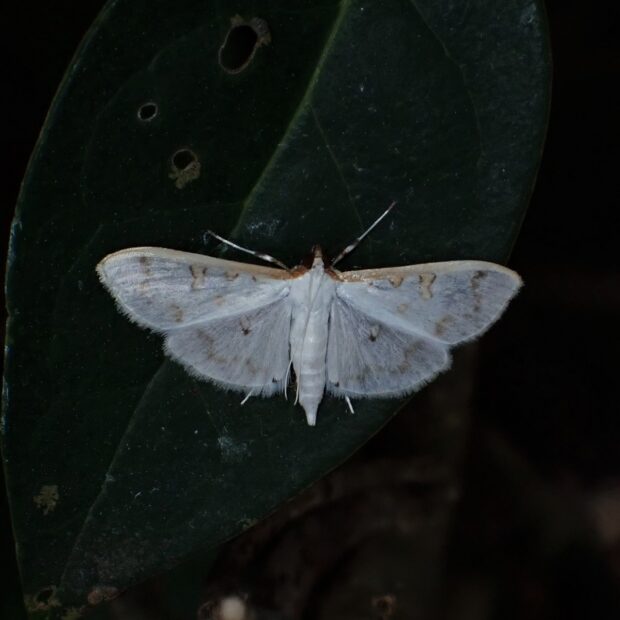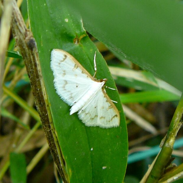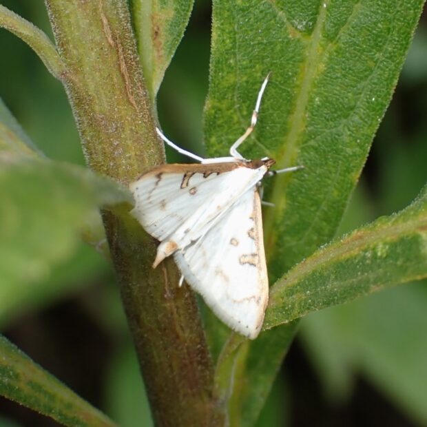 白色のはねに薄い茶色の紋がある小さなガ。 夜行性で明かりにやって来ます。 マエアカスカシノメイガに似ていますが、 本種ははねが白色で透けておらず、 紋が目立ちます。