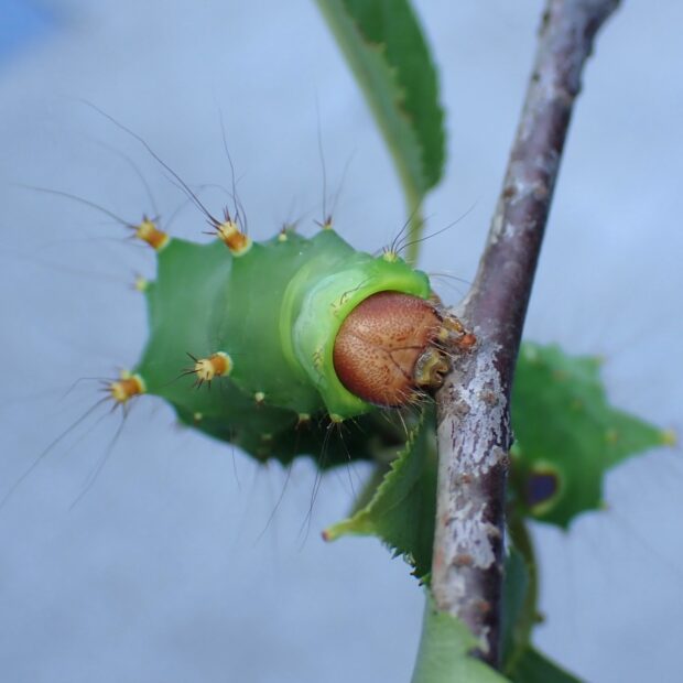 • 幼虫は黄緑色で節ごとに毛の束がある。