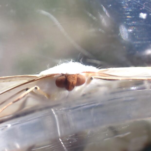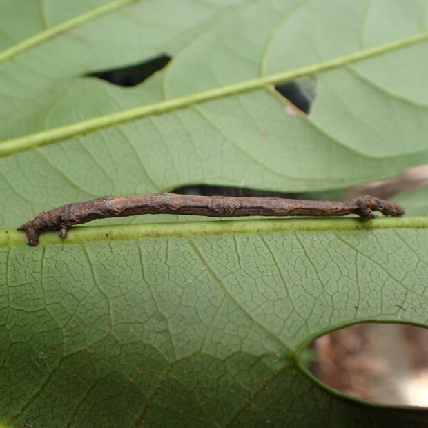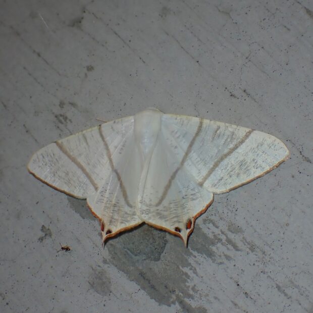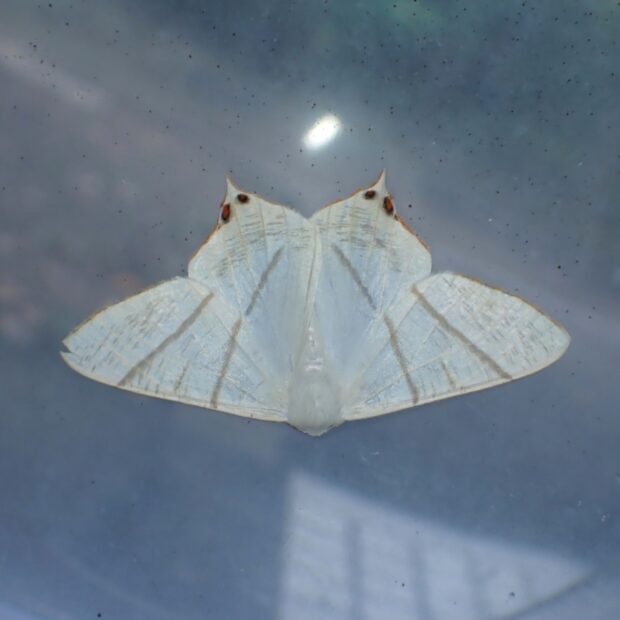 エダシャクの仲間。 白いはねに帯があり、 全体にさざ波が入っています。 尾状突起はとがり、 赤っぽい紋が2個ずつあります。 似ているツバメエダシャクの仲間は数種類いますが、 本種は最も普通に見られます。