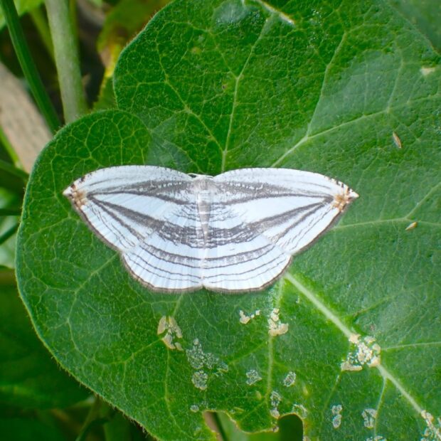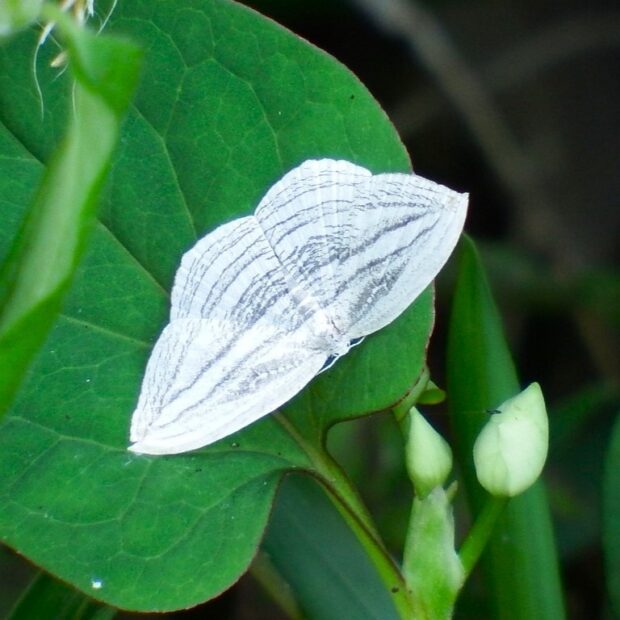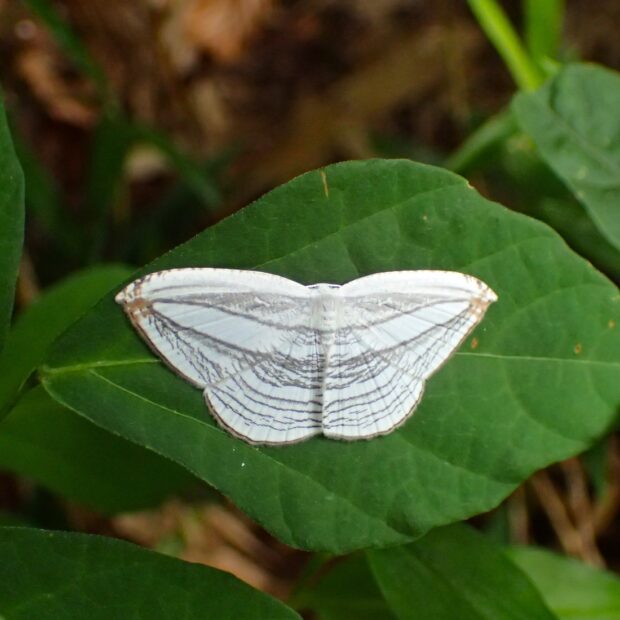ツバメガの仲間。 はねを広げてとまったとき、 たくさんの銀色の筋が前ばねの両端をつないでいるように見えます。 林縁の葉の上でとまっていることが多いです。 (MT)