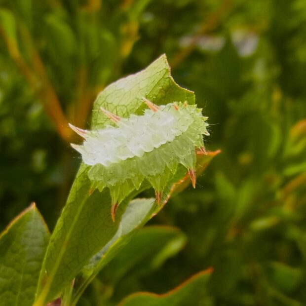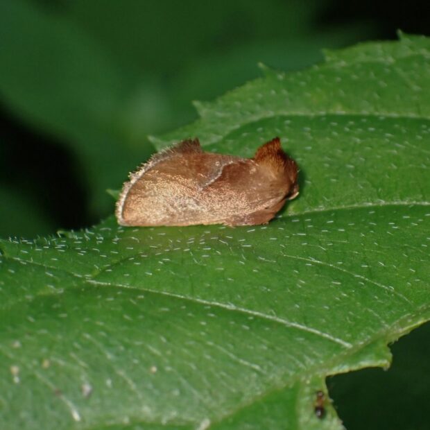 茶褐色で小さいイラガの仲間。 夜行性で、 昼間は葉の上などでじっとしています。 幼虫は淡い緑色で、 多数の突起を持ちます。 そのうち3対の突起が大きく、 先端が赤いです。 雑木林の他、 庭木や公園などでも見られます。