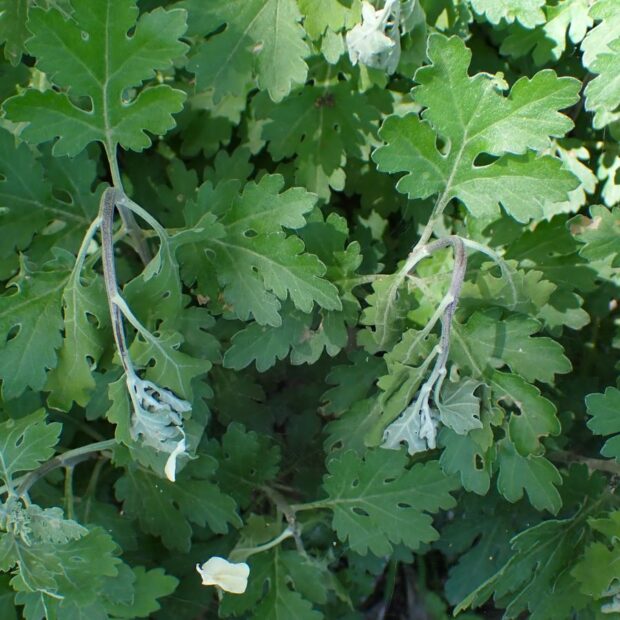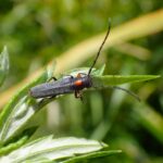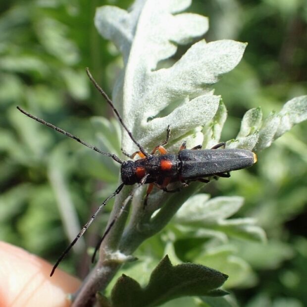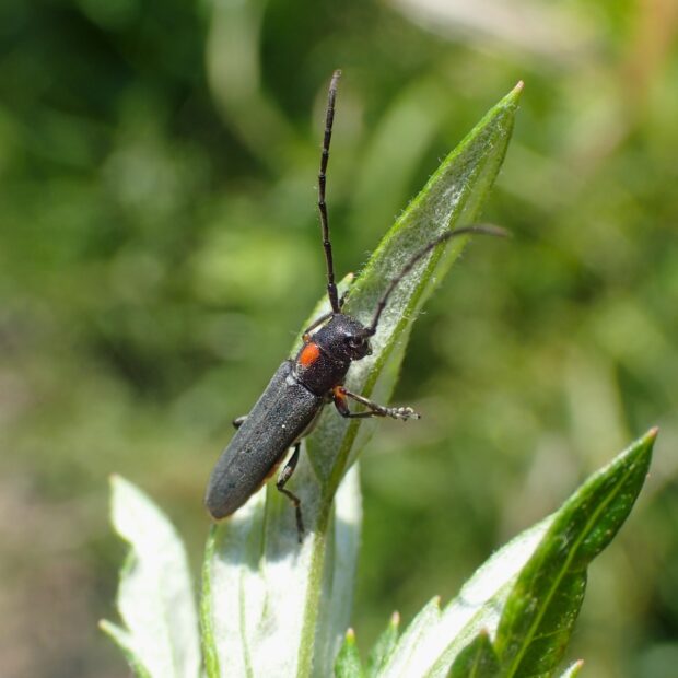 キク科植物で見られる、 体が黒く、 前胸に赤い紋がある小さなカミキリムシ。 メスは産卵のために、 茎の先端2か所の周囲をぐるりとかじるため、 先端部に水分が届かなくなり、 しおれてしまいます。 幼虫は夏に根に入り蛹になり羽化して成虫になります。 成虫は根の中で越冬し、 翌春に現れます。