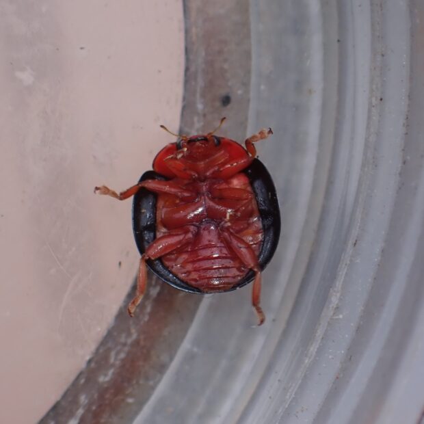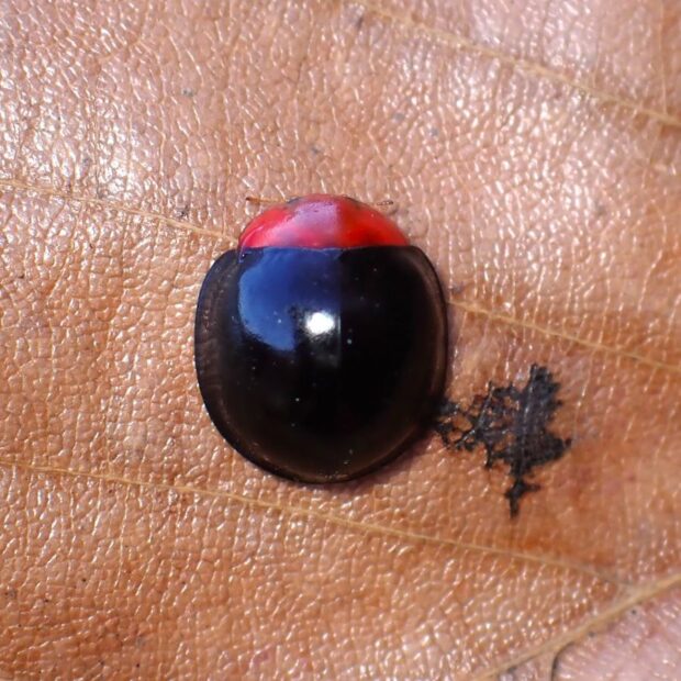 ツートンカラーの鮮やかなテントウムシ。 日本では2015年に記録された移入種で、 原産地は台湾、 中国南部、 東南アジアです。 カメムシの幼虫(主にマルカメムシの幼虫)を食べます。