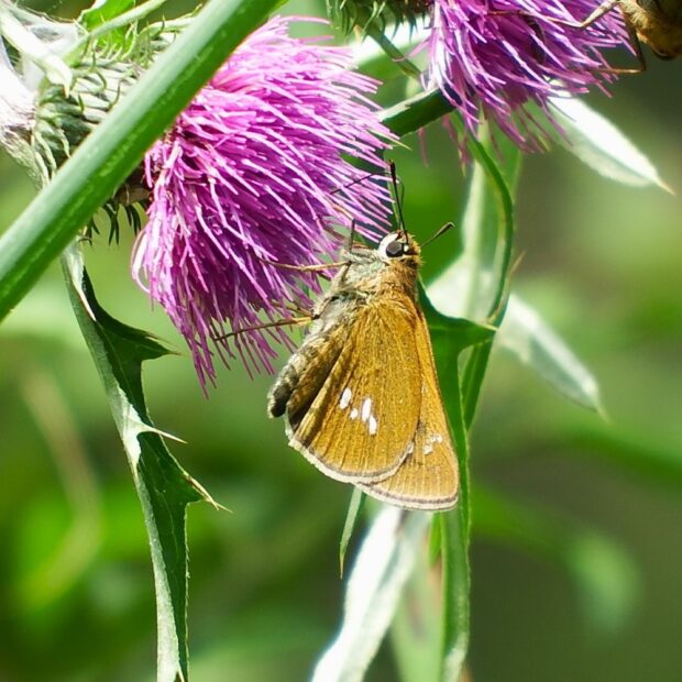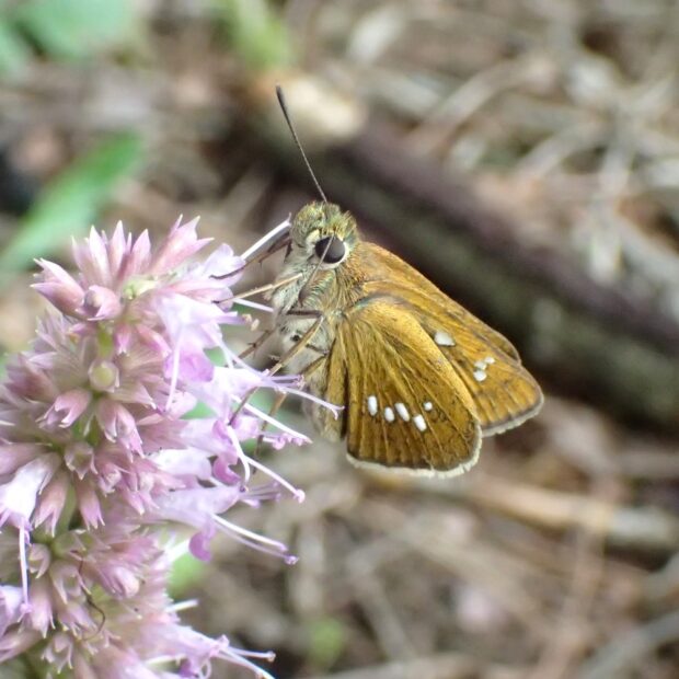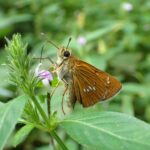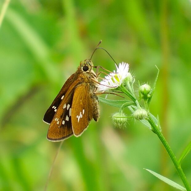 セセリチョウの仲間。 昼間に敏速に飛び、 花によくやって来ます。 後ばね裏面の白い紋がたがいちがいに並ぶのが特徴です。 6月頃に現れ、 夏から秋にかけて増えますが、 平地では著しく減少しています。 (MT)