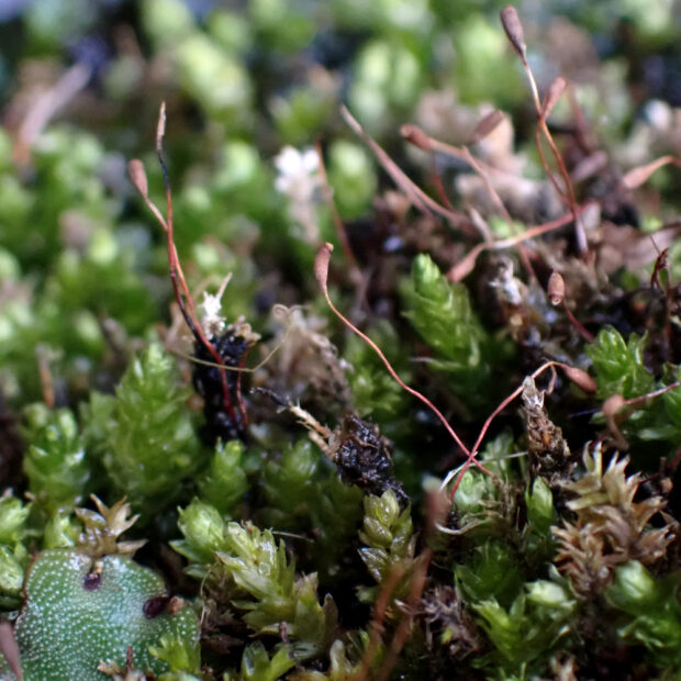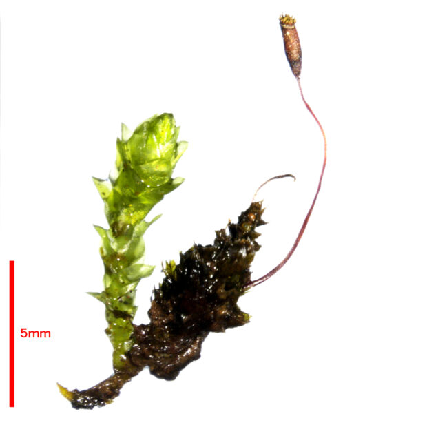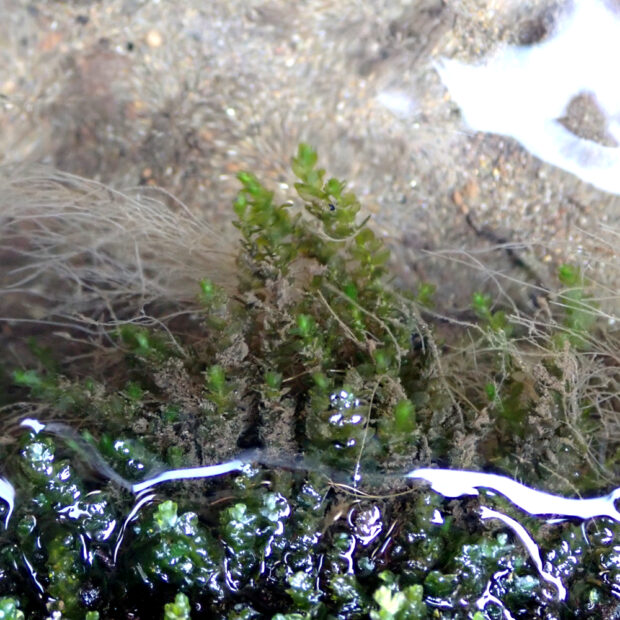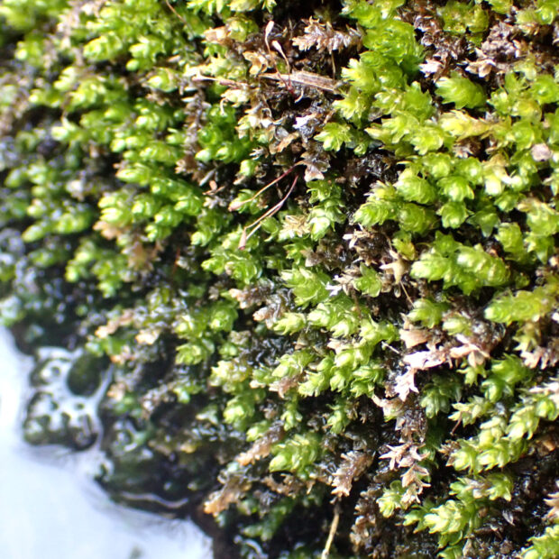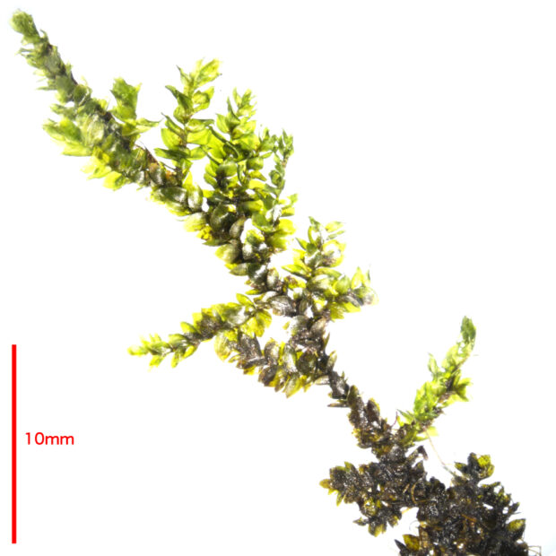 水の滴る場所や水中に生える大きめのコケで、 古い茎や葉ほど黒っぽい色をしていることが多いです。