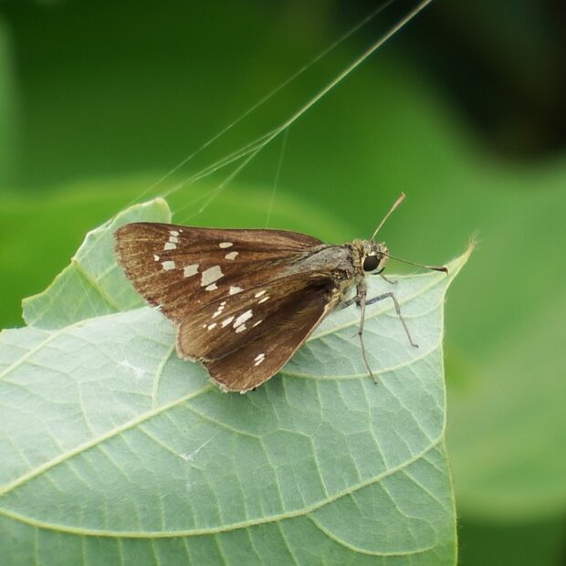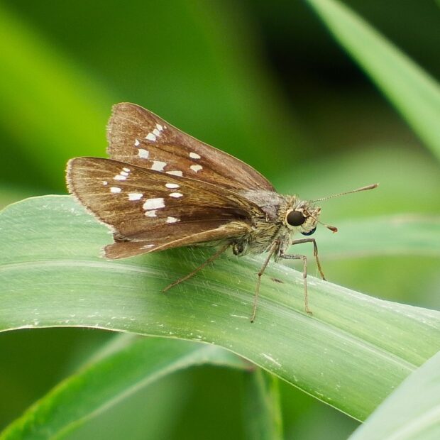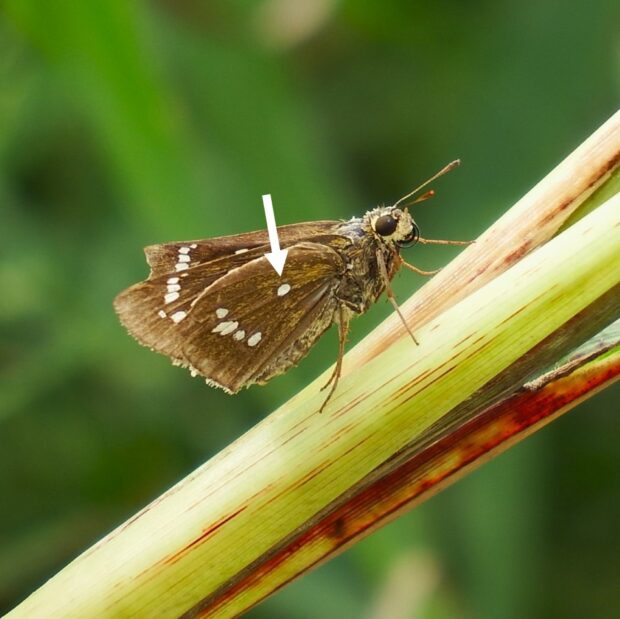林縁の草地、 河川敷のススキ草原などで見られるセセリチョウ。 後ばね裏面にジグザグの白い紋、 中ほどにはっきりした白い紋があるのが特徴です。 草原が少なくなり、 全国的に減少しています。 蛹越冬。 (MT)