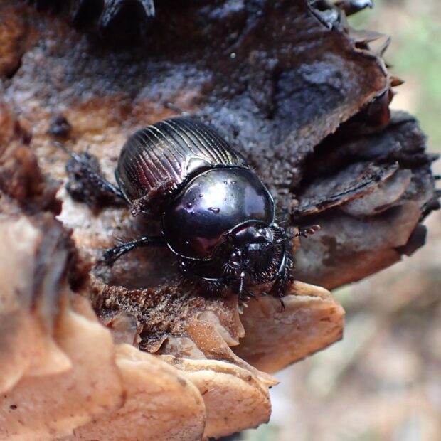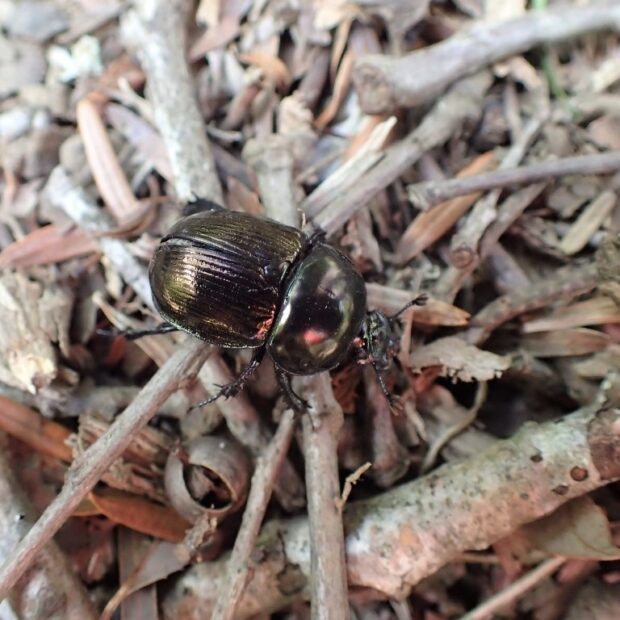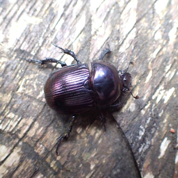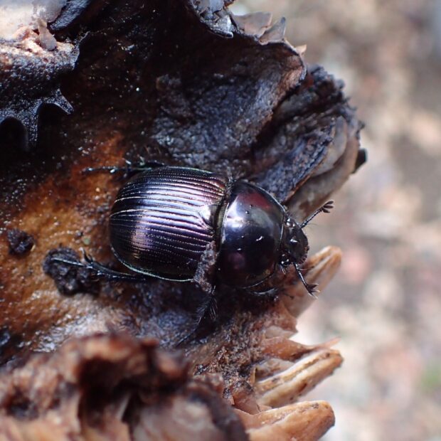 黒、 紫、 藍、 緑銅などの輝きをもつコガネムシ。 センチコガネの仲間は、 動物のフンなどに集まる糞虫(ふんちゅう)。 メスは地中にフンを運び込み卵を産み、 幼虫はフンを食べて育ちます。 生態系の分解者として大切な存在です。