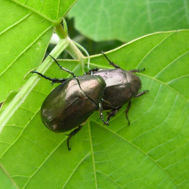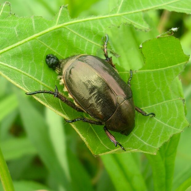 銅色をしたコガネムシの仲間。 「ブイブイ」はブンブン飛ぶ虫という意味の漢字からきているとのこと。 普通に見られますが、 東京近郊では、 アオドウガネが増え、 ドウガネブイブイは減少しています。