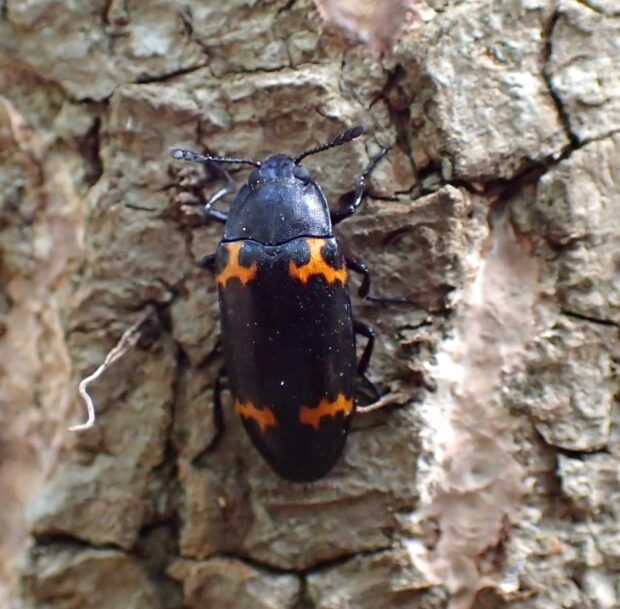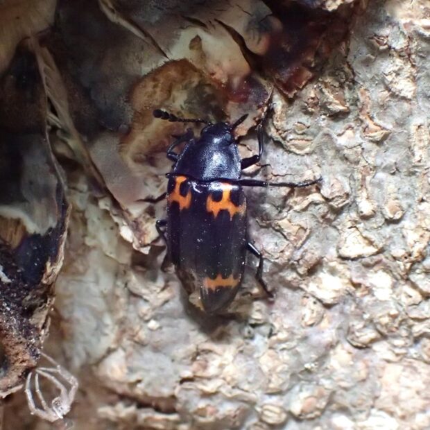 前ばねの上と下に朱色の模様があるオオキノコムシの仲間。 雑木林や公園で普通に見られ、 枯れ木につくカワラタケなどのキノコに集まります。 よく似た模様のものがおり、 識別には注意が必要です。