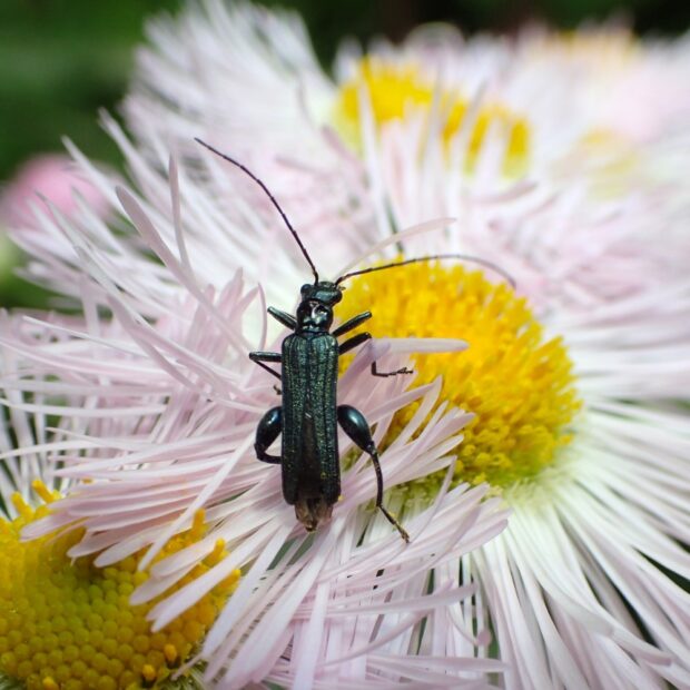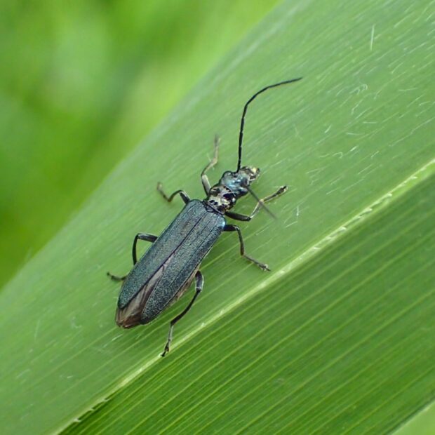 カミキリモドキの仲間は体液にカンタリジンを含むものが多いです。 カンタリジンを含む体液に触れると、 皮膚に炎症をおこし、 水ぶくれができることがありますので、 触らないようにしてください。