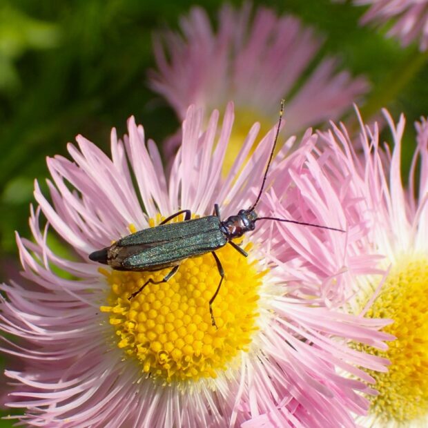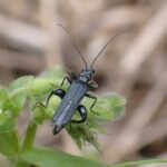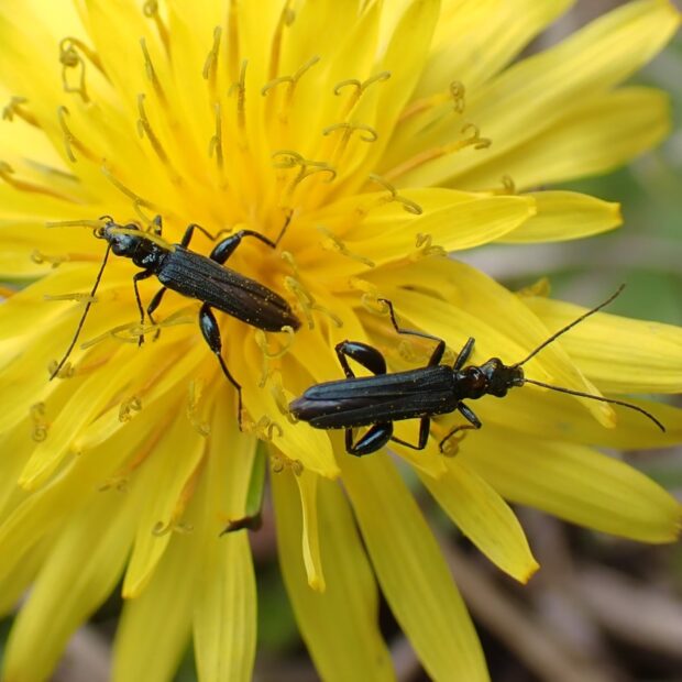 カミキリモドキの仲間。 春、 タンポポなどの花で普通に見られます。 オスは、 後あしの腿節(たいせつ)がふくらみますが、 メスはふくらまずにほっそりしています。 カミキリモドキは体が柔らかいという特徴があります。