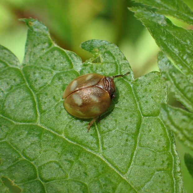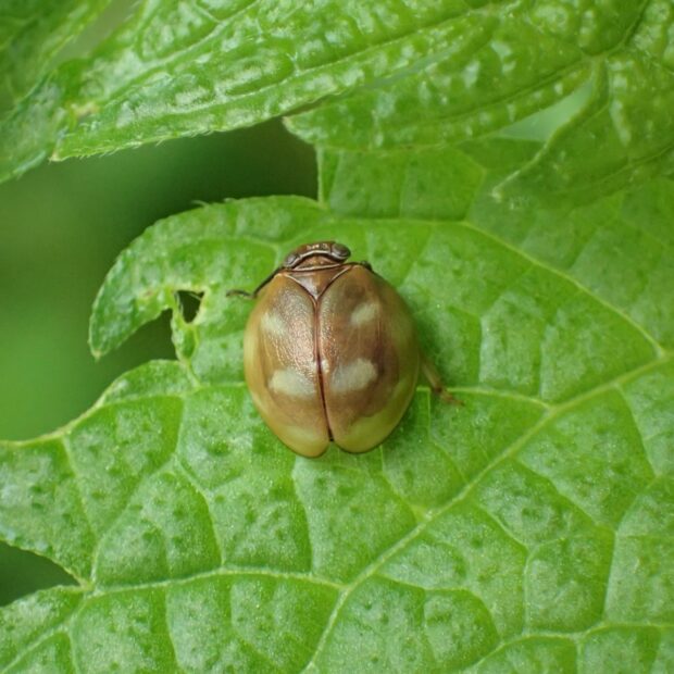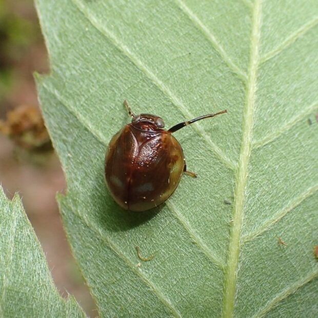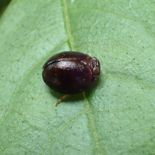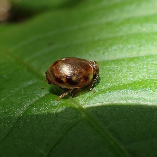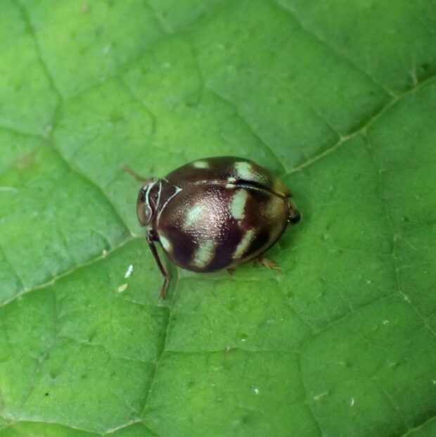 まるい形が特徴のマルウンカの仲間。 体の色や模様は変異に富みます。 白い紋があるものが多いですが、 全身が黒褐色のタイプもいます。 山地の林縁などで見られ、 驚くと、 ピョンと跳んで逃げます。 (MT)