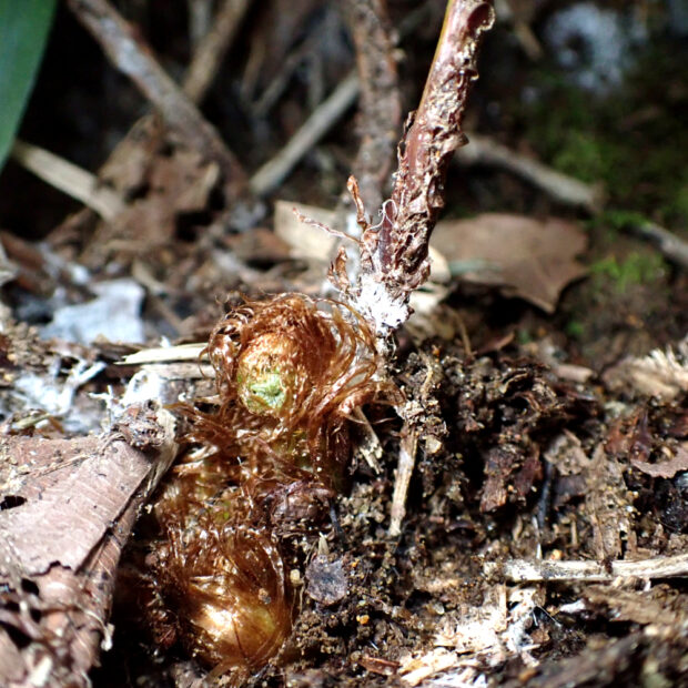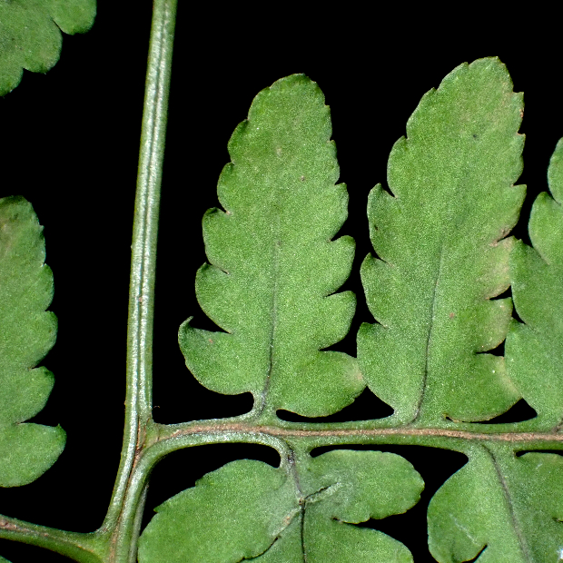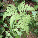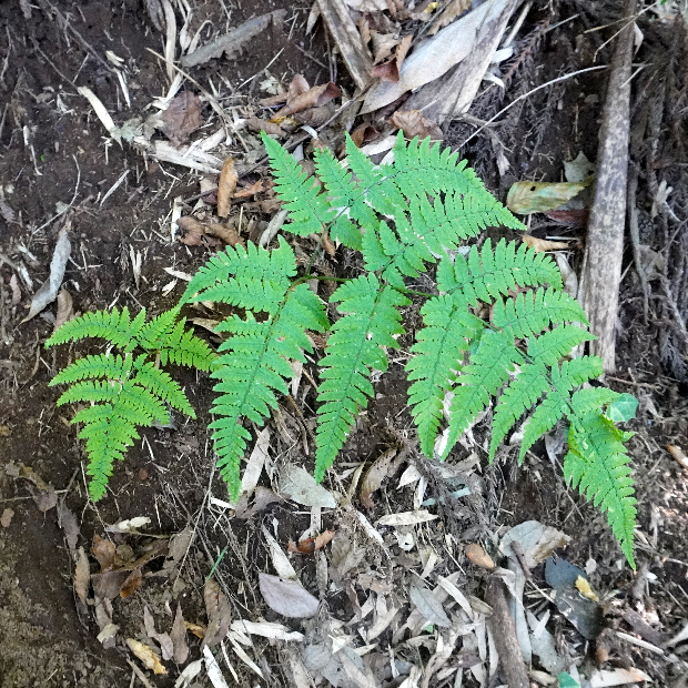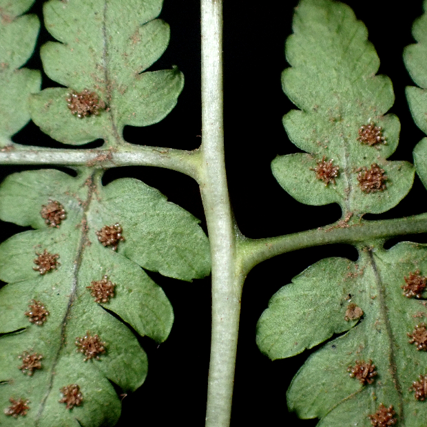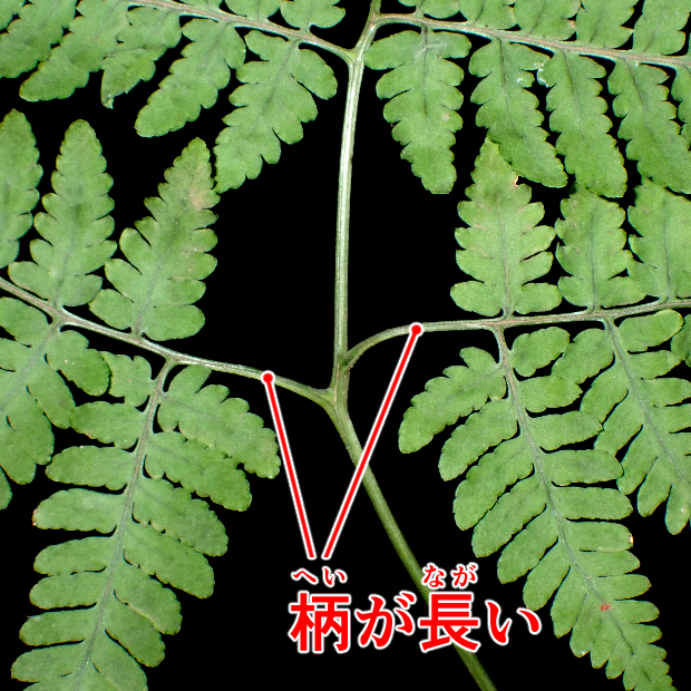 ●ミサキカグマは①最下羽片の柄が短めで、 ②最下羽片はカマ状に大きく曲がらず、 ③胞子のう群は葉のフチ寄りにつきます。