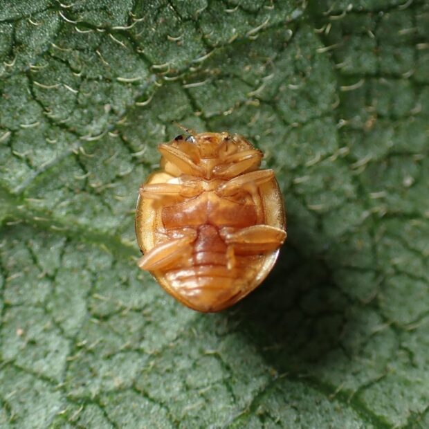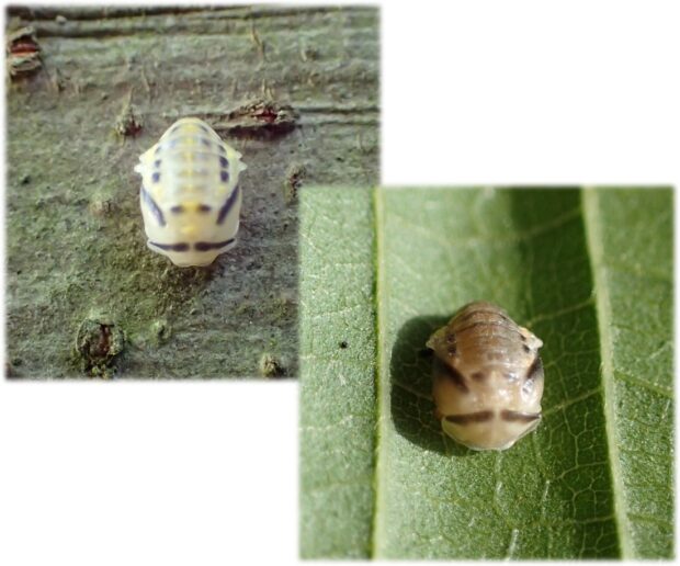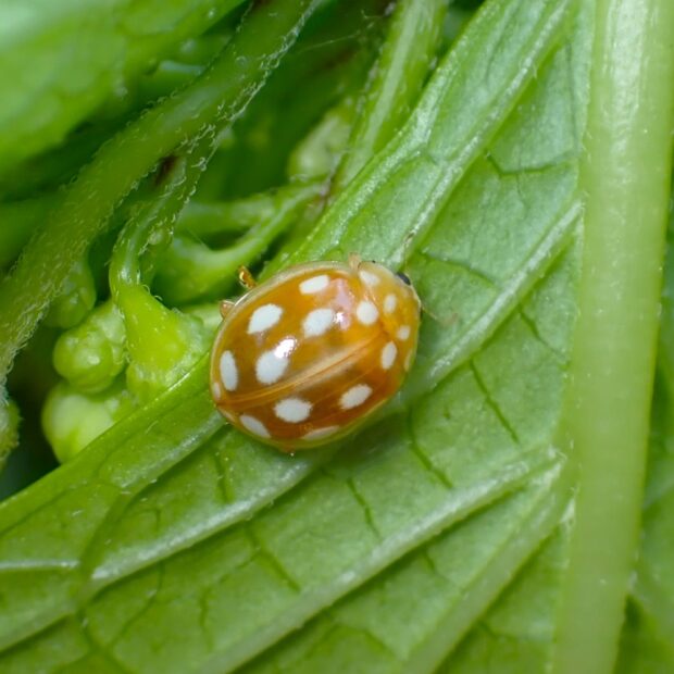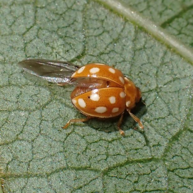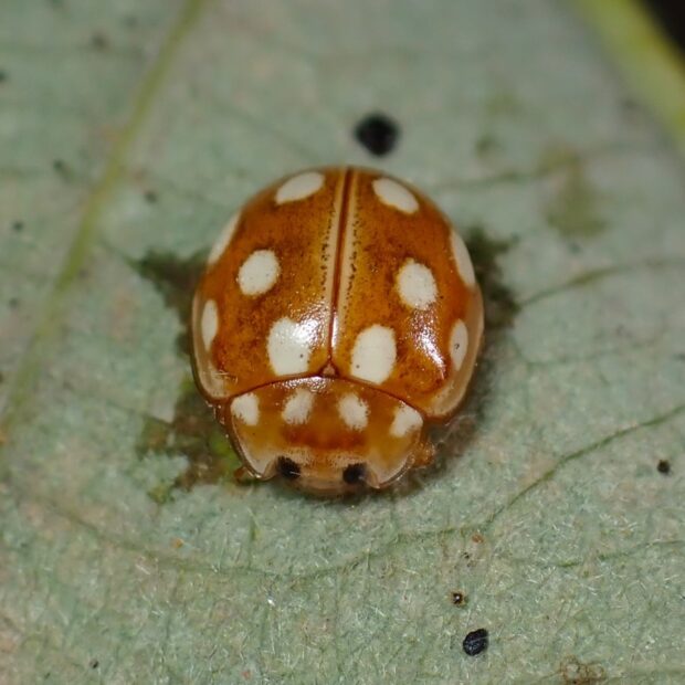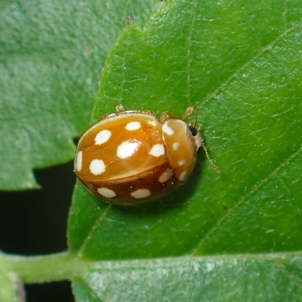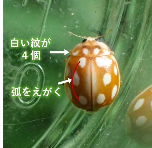 黄褐色~赤褐色の体に白い紋があるテントウムシ。 前胸の白い紋は4個あります。 都市公園・緑地~山で普通に見られ、 エノキやケヤキで見つかることが多いようです。