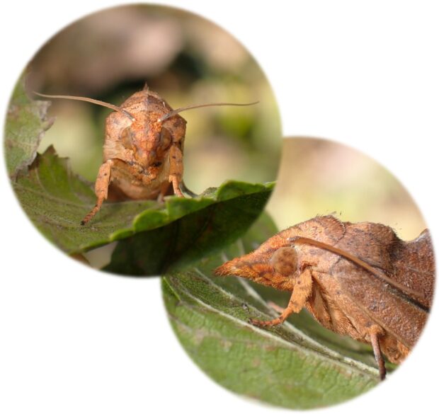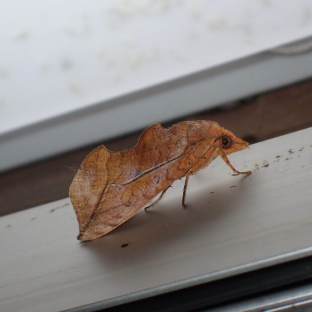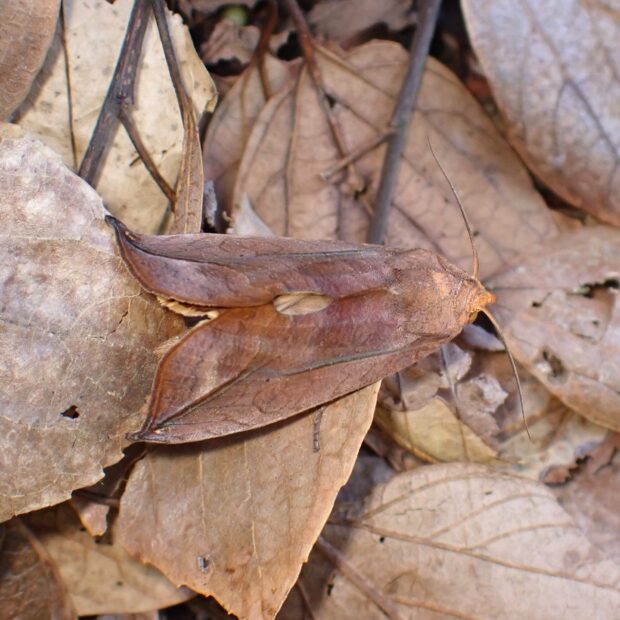 ヤガ科エグリバの仲間。 全体に赤みのある茶色で、 はねをたたむと背面の凸凹がはっきりしています。 顔が尖っているのも特徴です。 フルーツに口吻を刺しこんで汁を吸います。