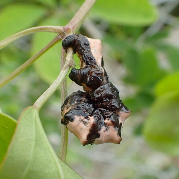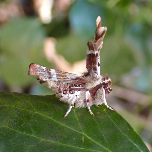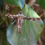 早春にあらわれるエダシャクの仲間。 成虫も幼虫も個性的な姿をしています。 成虫は、 はねを折りたたみ、 独特の姿勢でとまります。 幼虫は頭を腹側に折り曲げ、 鳥のフンのようなシャクトリムシです。 (MT)
