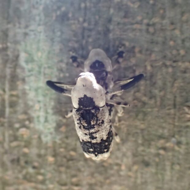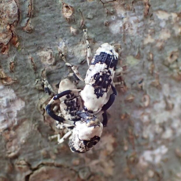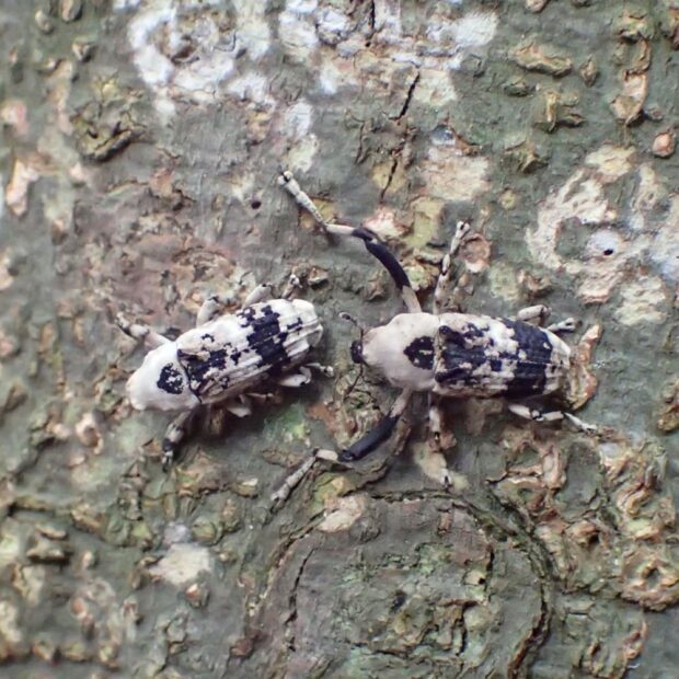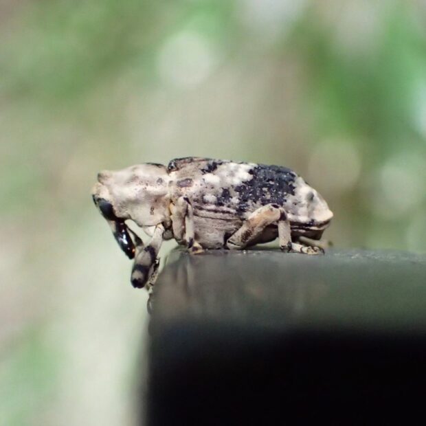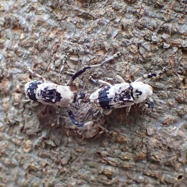 エノキの枯れ木に集まるゴツゴツしたゾウムシ。 オスの前あしが長いのが特徴。 危険がせまると、 あしを折りたたみ死んだふりをします。 メスをめぐり、 オスどおしで、 長い前あしを使い争います。