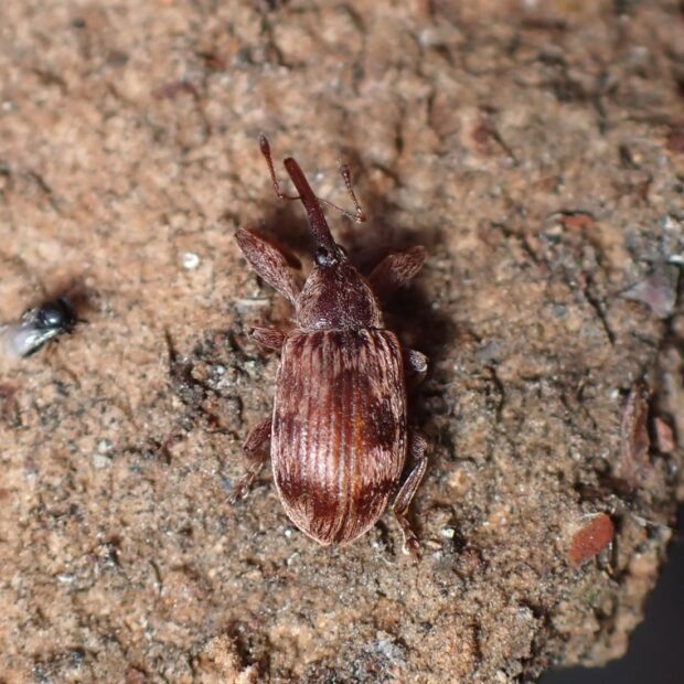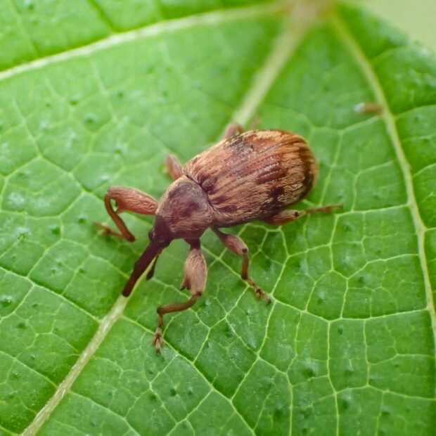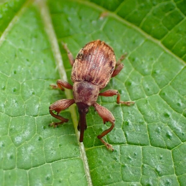 ハナゾウムシの仲間。 体は毛深く明るい茶色。 上翅(じょうし)の毛が生えていない部分は色が濃く、 ひし形に見えます。 メスはサクラの実に産卵し、 幼虫はサクランボを食べると言われています。