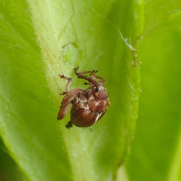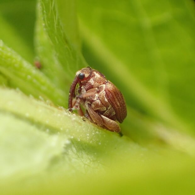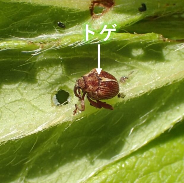 小さなサルゾウムシの仲間。 ツツジのつぼみの周りのベタベタをものともせず、 つぼみを食べます。 公園の植栽のツツジで普通に見ることができます。 つぼみや花を食べると、 そこの部分が茶色の斑点になります。