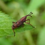 ツユクサにいるあずき色のゾウムシ