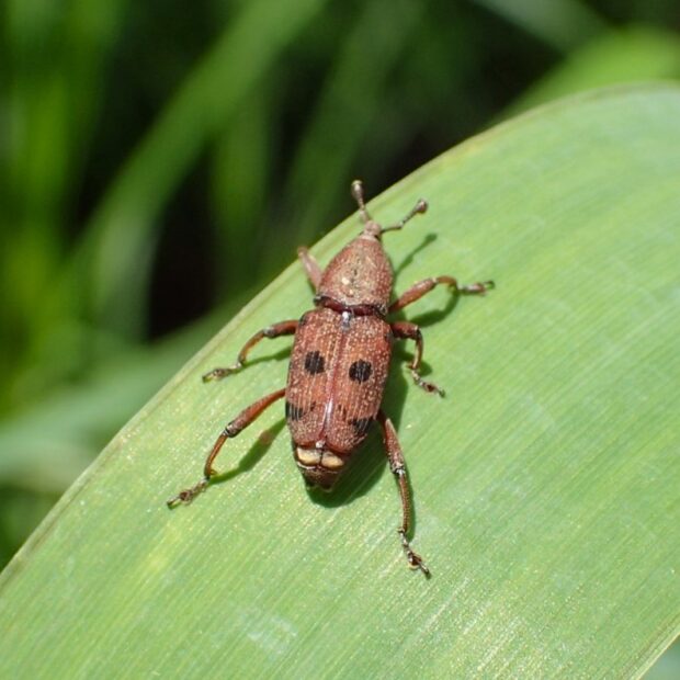 小さなオサゾウムシの仲間。 赤っぽい色をしており、 胸には黒い筋、 上翅には黒い紋があります。 メスはツユクサの茎に口吻を突き刺して穴をあけ、 卵を産みます。 ツユクサで普通に見られます。