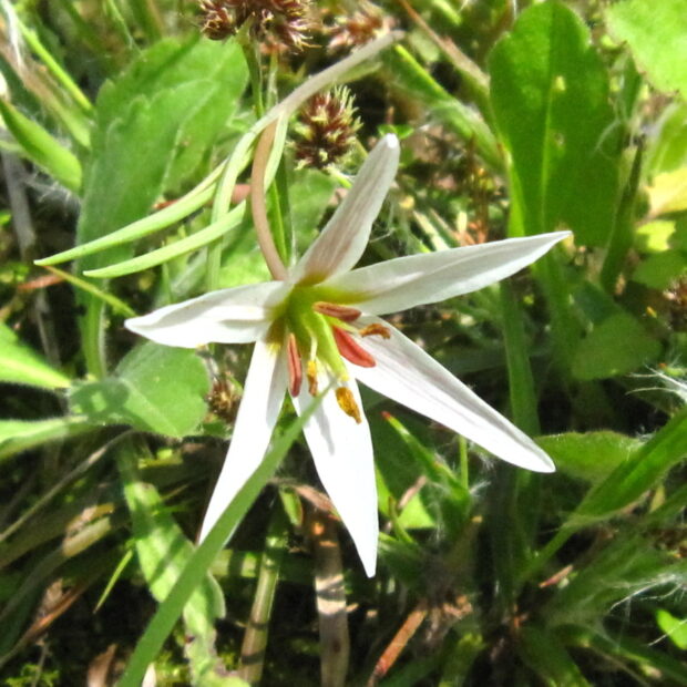 幅0.5-1cmほど、 長さ20cm前後の細長い葉を2本伸ばし、 その間から15cmほどの花茎を出して先端に白い花を1つ咲かせます。
