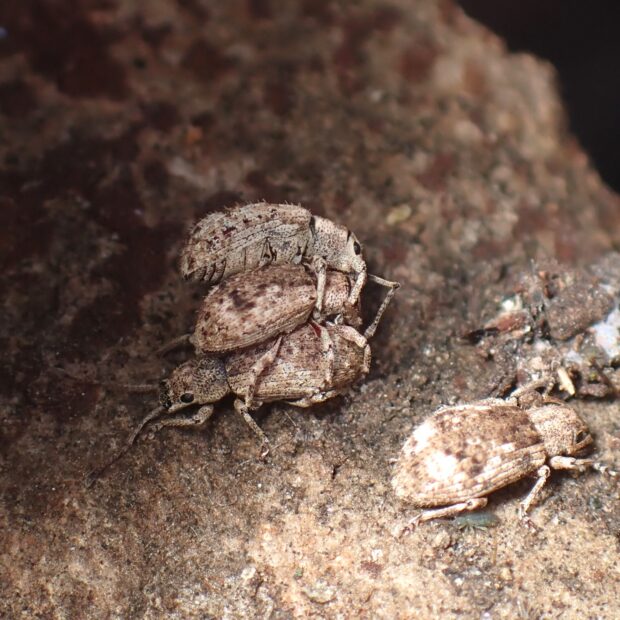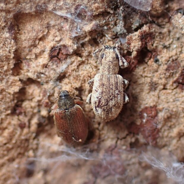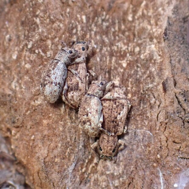 口吻(こうふん=細長い口の器官)が短いクチブトゾウムシの仲間。 体全体に毛のような鱗片があります。 冬、 ケヤキの樹皮下で越冬している姿をよく見かけます。