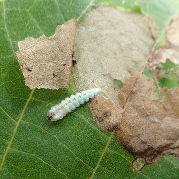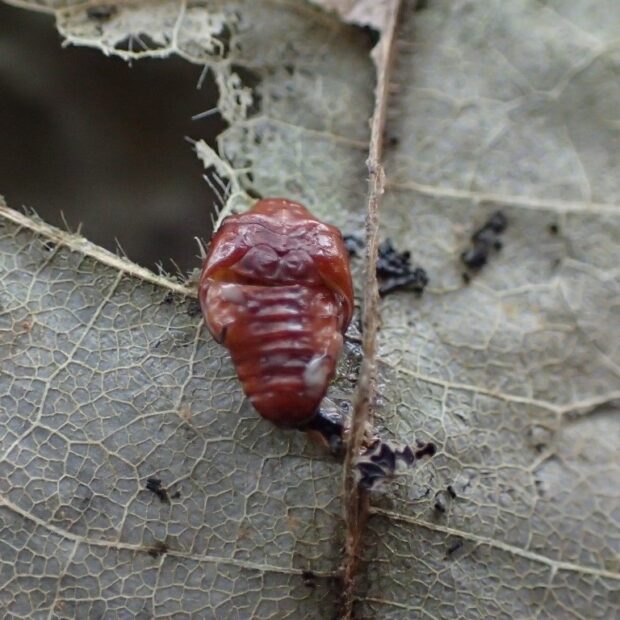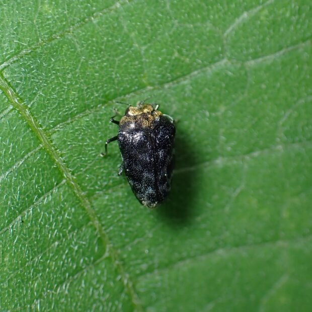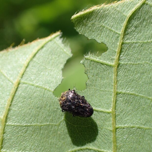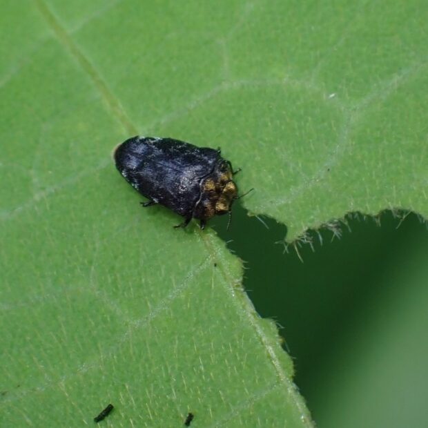 クズの葉で普通に見られるチビタマムシ。 幼虫がいると、 クズの葉の一部が白く透けたようになります。 成虫は、 葉の縁からジグザクに食べ進むことが多いです。 葉の食べあとを探すことがこの虫を見つけるコツです。