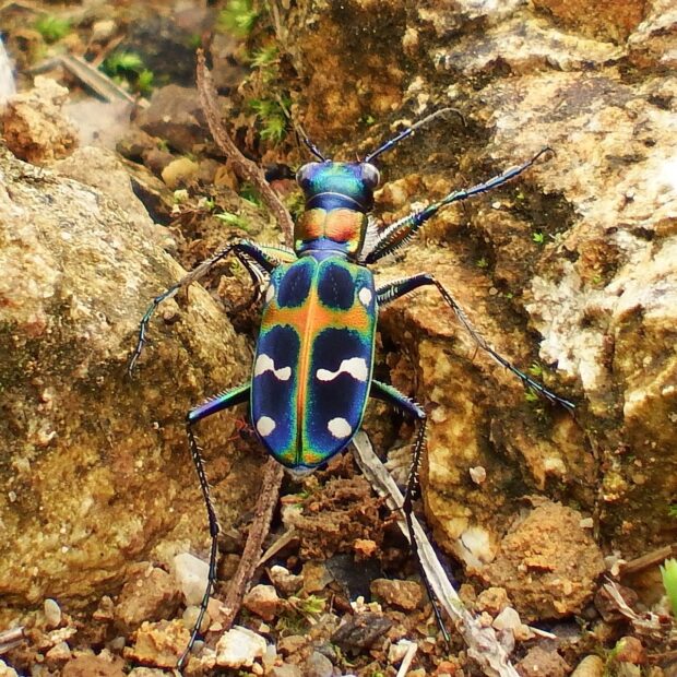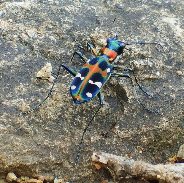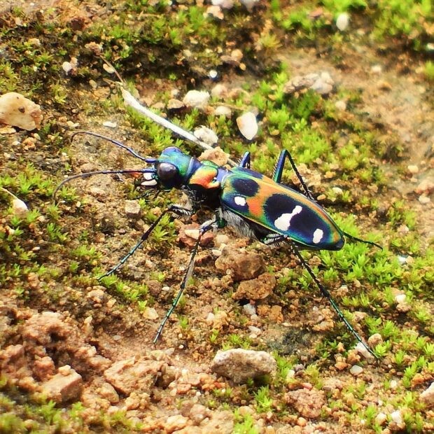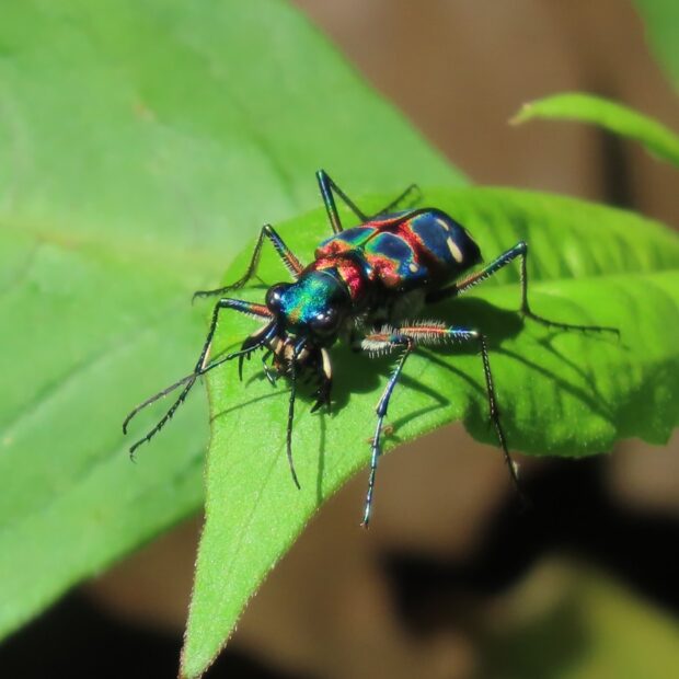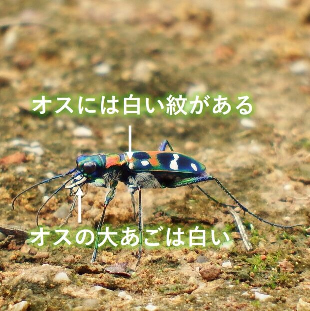 オサムシの仲間。 青、 赤、 緑の光沢がある美しいハンター。 大きな複眼、 長いあし、 大きく鋭い大あごをもち、 昆虫など小動物をとらえて食べます。 人が近づくと、 少し先に移動することから「ミチオシエ」と呼ばれます。 幼虫も肉食で、 地面に縦穴を掘り、 獲物を待ちかまえます。