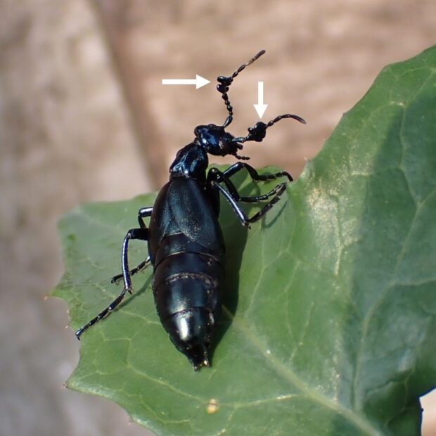 毒を持つツチハンミョウの仲間。 ハンミョウの仲間ではありません。 体は藍色、 後ばねは退化して飛ぶことはできず、 草地を歩き回ります。 メスは土の中に数千個もの卵を産みつけ、 ふ化した幼虫はハナバチの巣で育ちます。