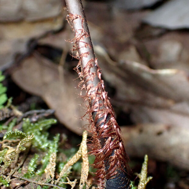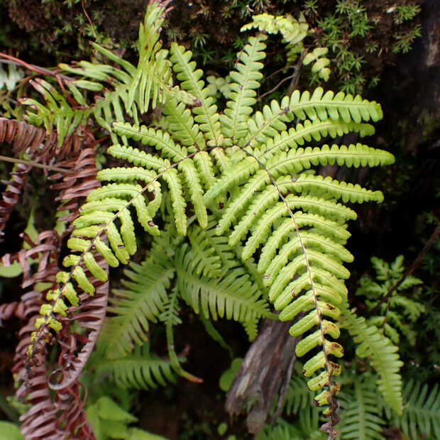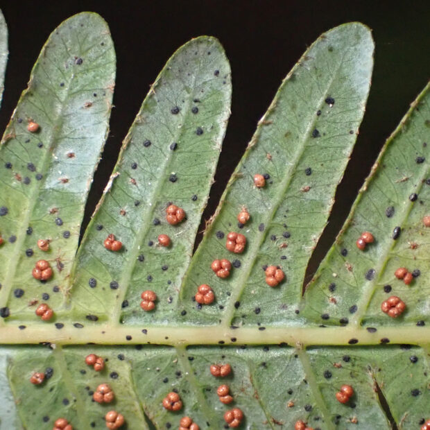 ●カネコシダはウラジロと同属でよく似ていますがより希少です。 ①九州以南に分布し、 ②葉裏はあまり白くなく、 ③小羽片は細くて葉軸と斜め(鋭角)につき、 ④小羽片の裂片先は尖ることなどが特徴です。