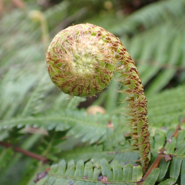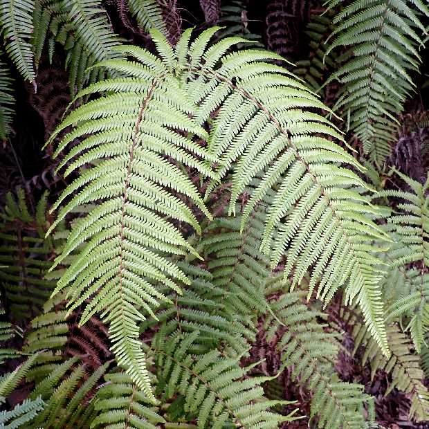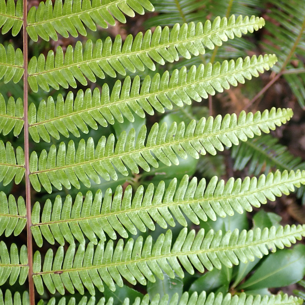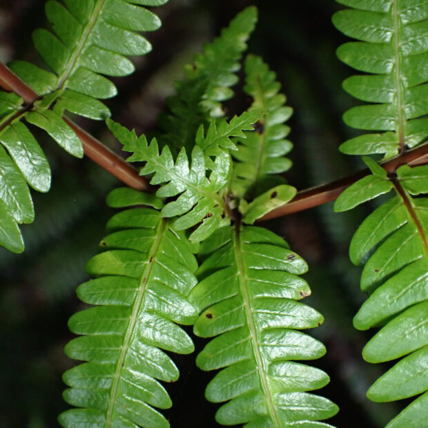 暖かい地域でごく普通に見られる大きなシダです。 しばしば道路沿いや林内を覆いつくすように群生します。 その名のとおり葉裏が白っぽいです。 逆Vの字形の葉はシダの中でも変わっています。