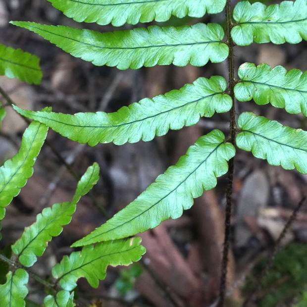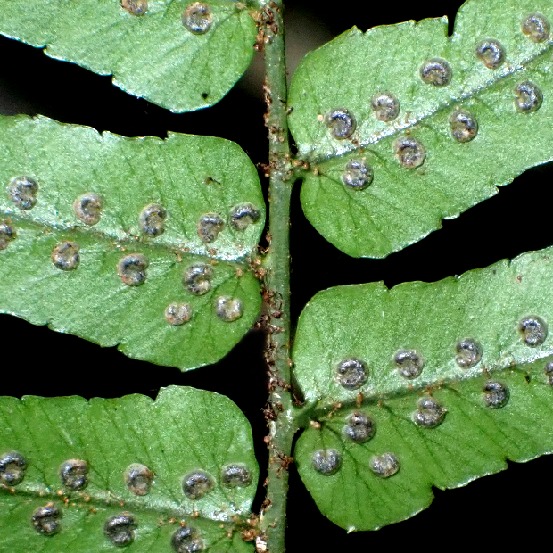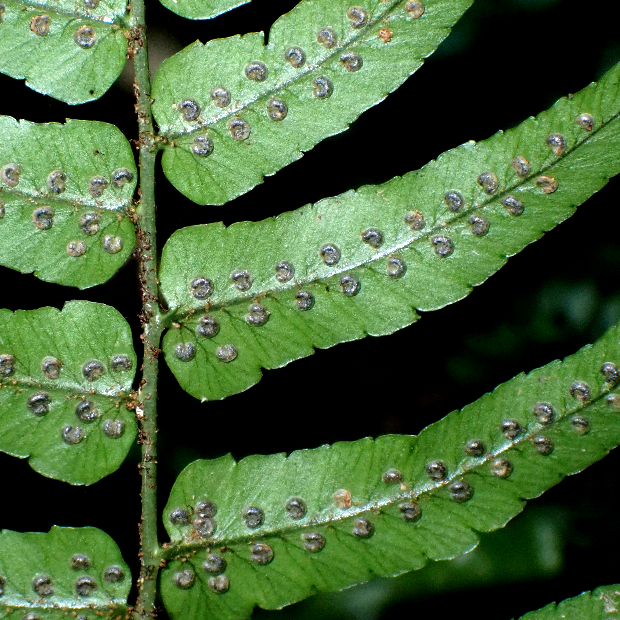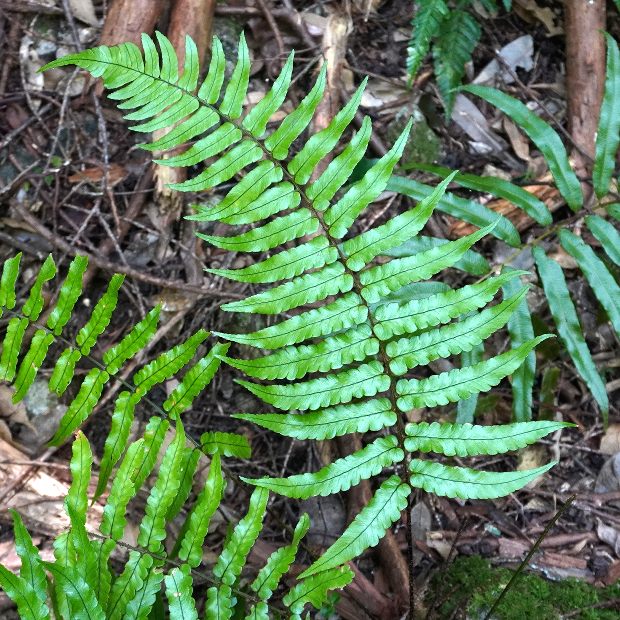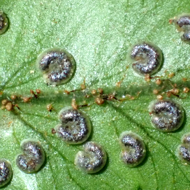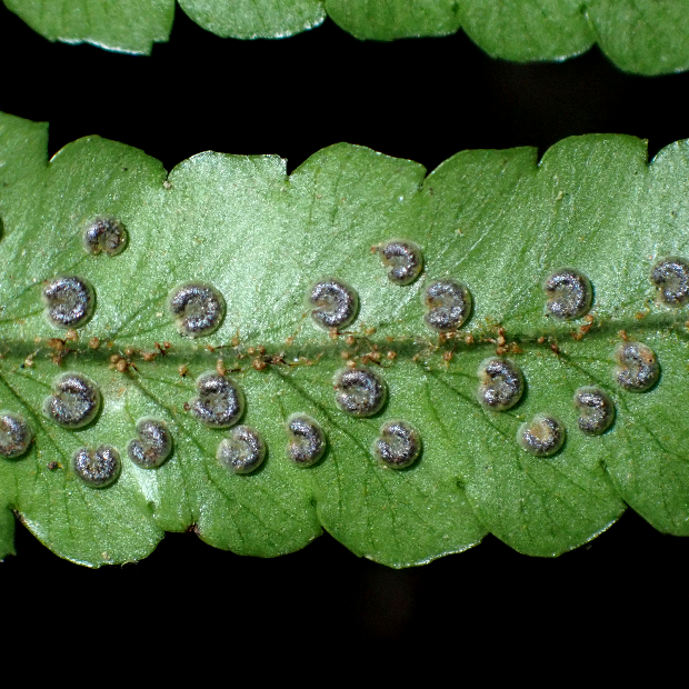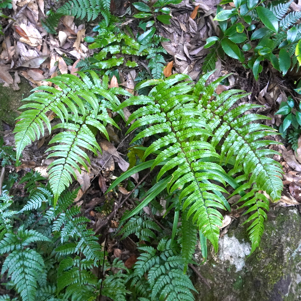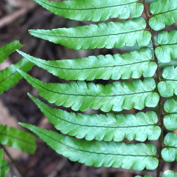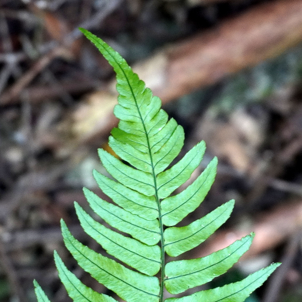 暖かい地域の林内に生えるシダ。 葉は厚みがあって羽片が浅く切れ込み、 裏の胞子のう群が丸くて目立ちます。 名前はシダの宝庫である和歌山県の那智山と、 葉を広げる姿がクジャクの羽に似ていることに由来します。