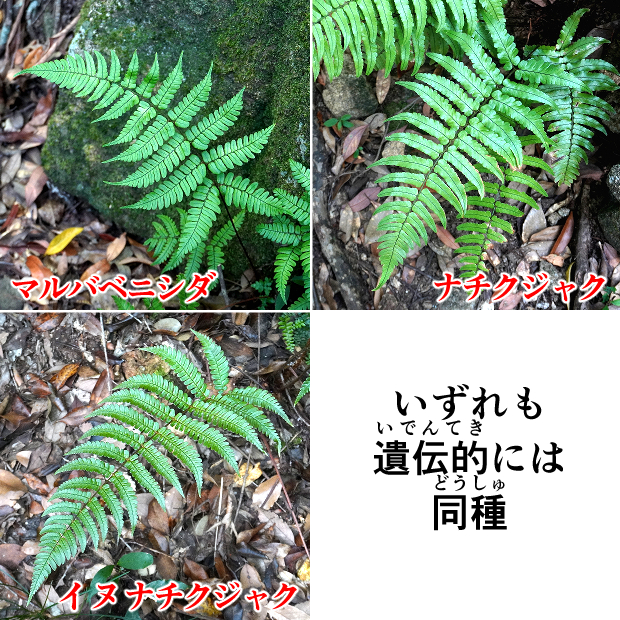 実際に遺伝子を用いた研究では、 ナチクジャク、 マルバベニシダ、 そして両者の中間のような姿のイヌナチクジャクをはっきり区別することができないことから同一種とする考えもあります。 ただ、 見た目が明らかに違うことなどから否定的意見も多いです。