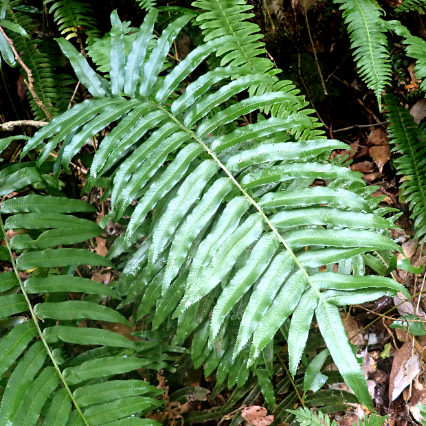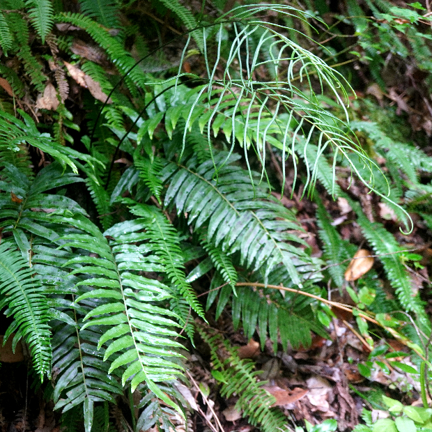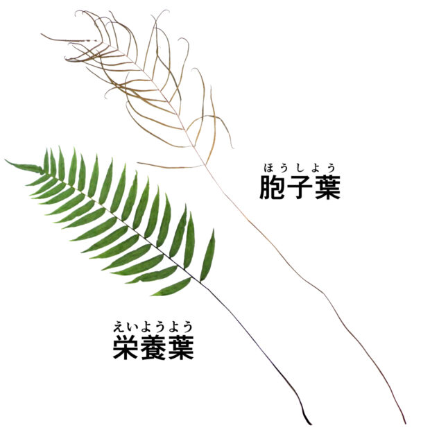 暖かい地域の林内にたくさん生えているシダです。 光合成をする葉はキジの尾羽のような形をしています。 胞子を飛ばす葉はとても細くて、 夏ごろに出します。