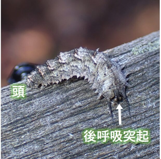 黄色の波形模様が特徴のヒラタアブ。 メスははっきりした波形になりますが、 オスは不明瞭です。 幼虫はへん平で、 襟巻のように枝に巻きつくことからエリマキアブと呼ばれます。 (MT)