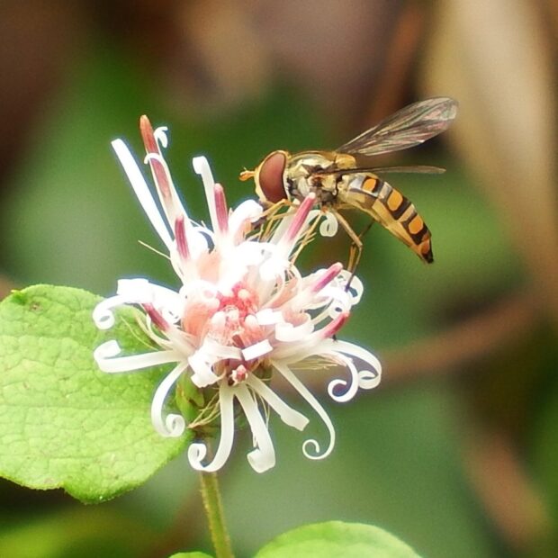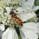 花から花へ、 お馴染みのヒラタアブ