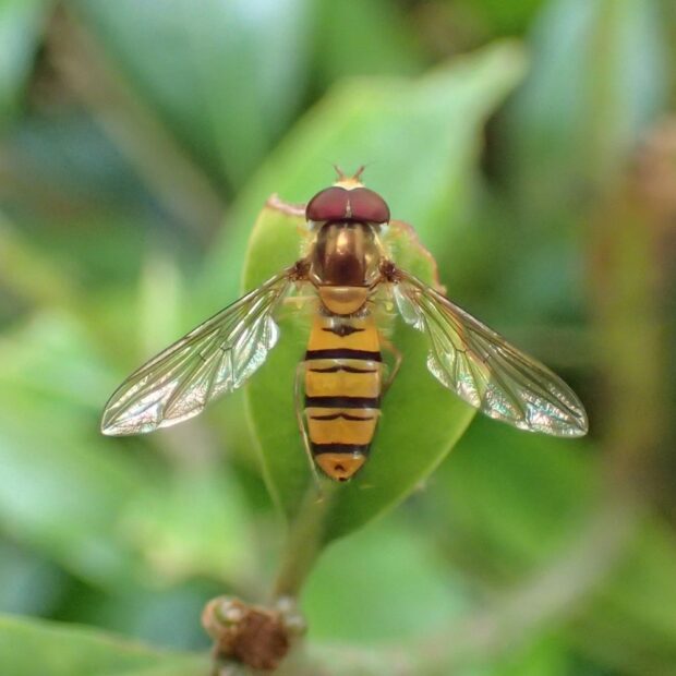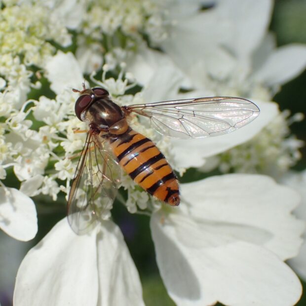 最も普通に見られるヒラタアブの仲間で、 家の庭でも見られます。 ほっそりした腹部には太い帯と細い帯の各2本ずつの帯があります。 花から花へホバリングをしながら飛び回ります。