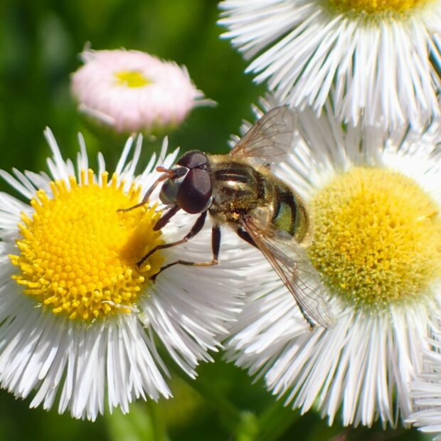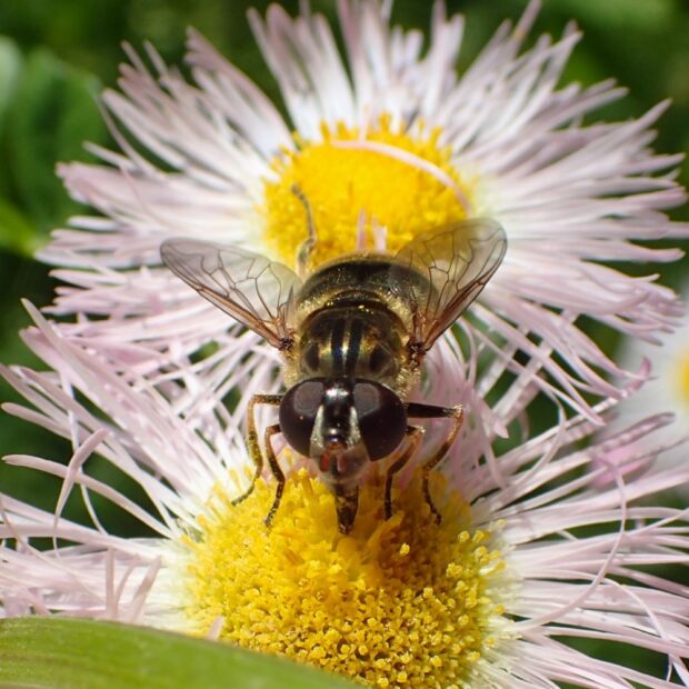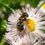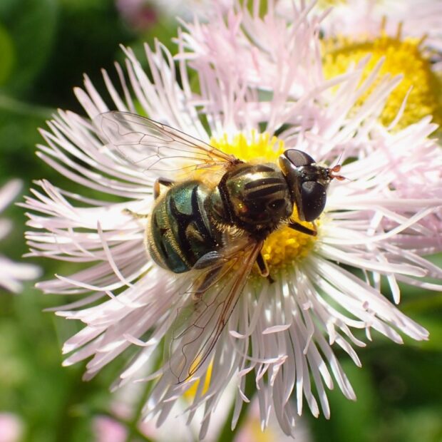 るり色の光沢がある美しいハナアブ。 胸部には黒い縦線、 腹部には「エ」字形の黒色の紋があります。 水辺周辺の花にやって来ます。