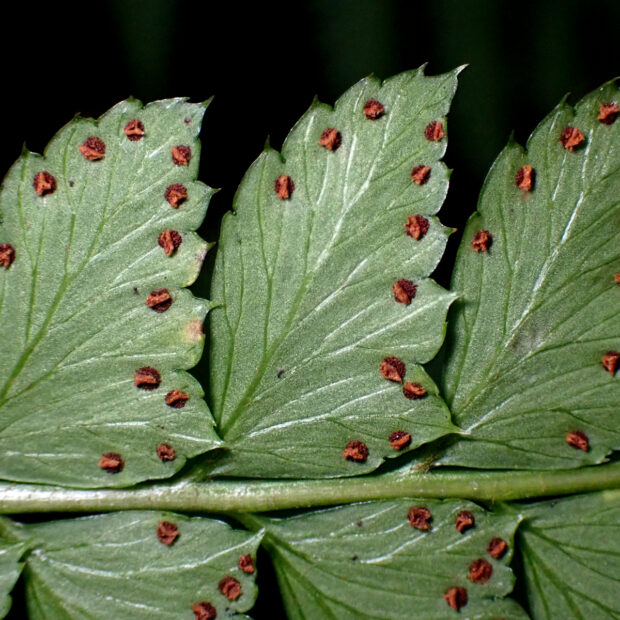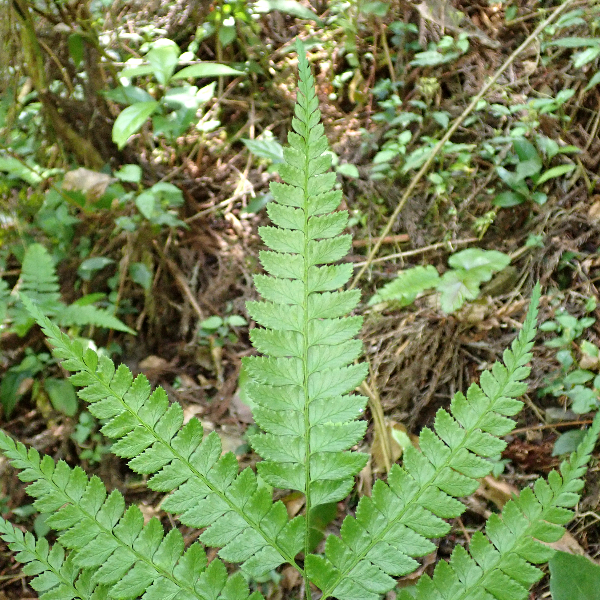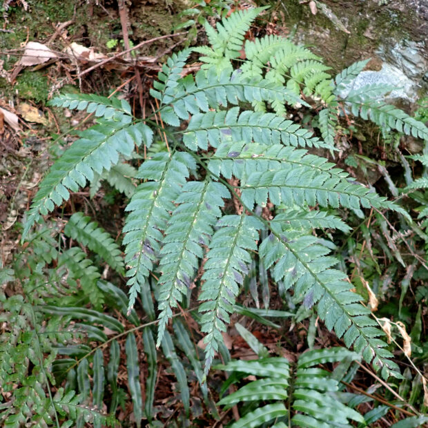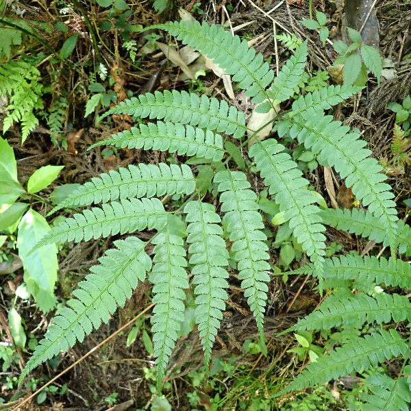 暖かい地域の林内に多いシダです。 多くのカナワラビ類の葉は金属のようにテカテカしていますが、 本種はあまり光沢がありません。 根茎は短くはって群生せず、 大きめの葉を1,2枚だけ出していることが多く、 いわばシダ界の一匹狼みたいです。