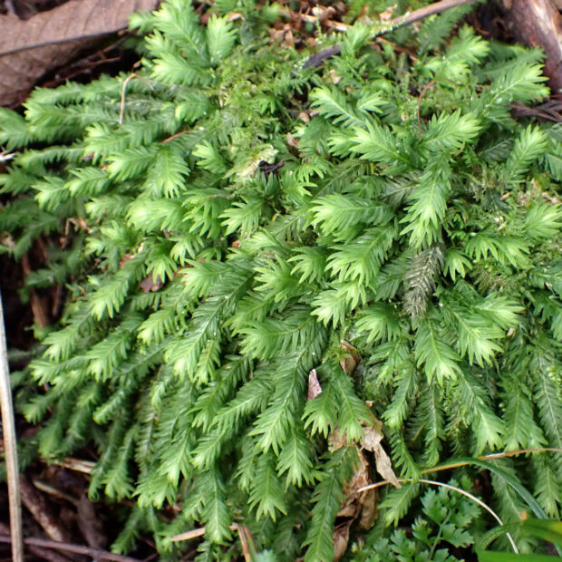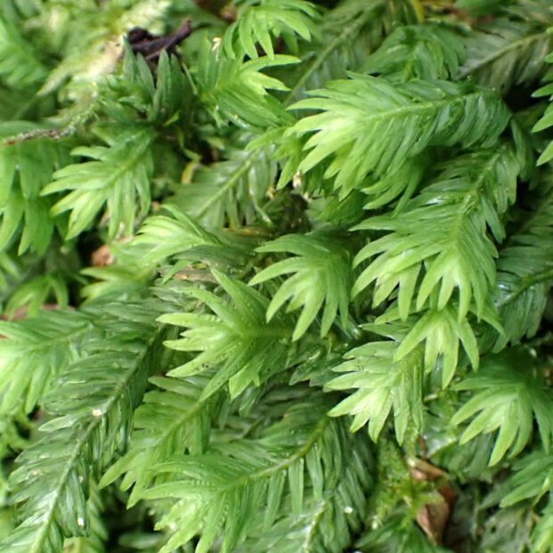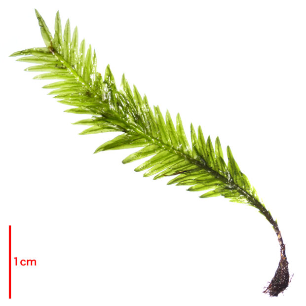 山地の林内に生える大型のコケ。 ホウオウゴケの仲間は神話上の鳥「鳳凰(ほうおう)」の尾に例えられた形が特徴で、 その中でも本種は特に大きくなるのでインパクトがあります。