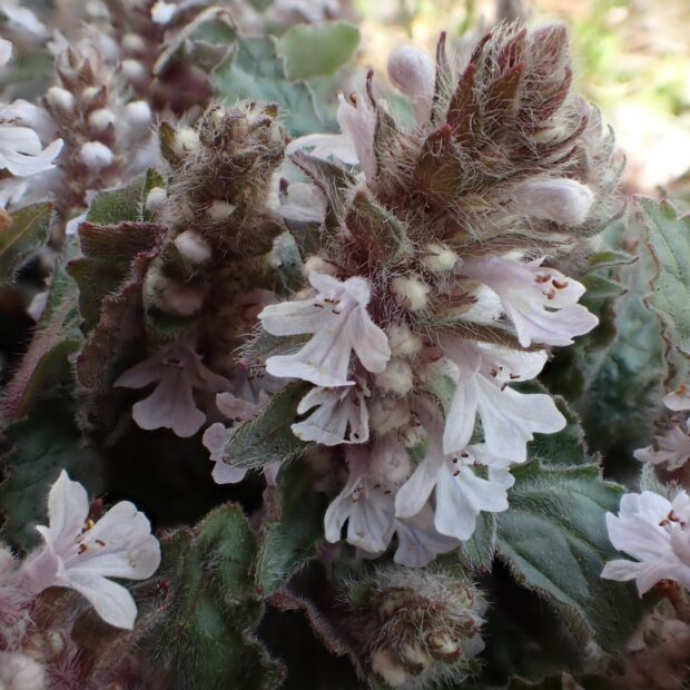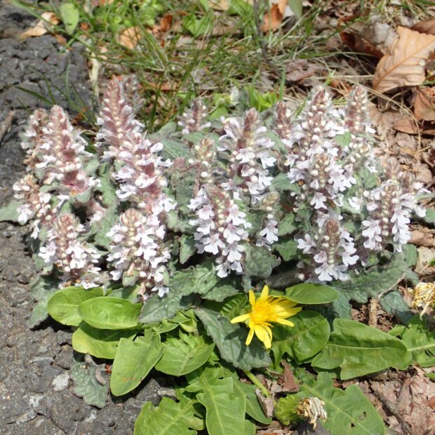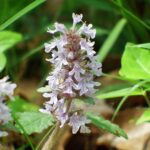 花が重なって何段にもつく様子を平安時代の女性の正装に見立てて十二単(ジュウニヒトエ)の名がつきました。 キランソウとの間に自然交雑種ジュウニキランソウがありますが、 濃い紫色の花が咲く常緑の園芸種セイヨウジュウニヒトエが各地で野生化しており、 これとの交雑種も報告されています。