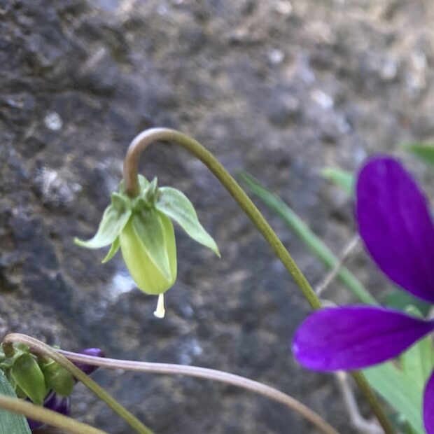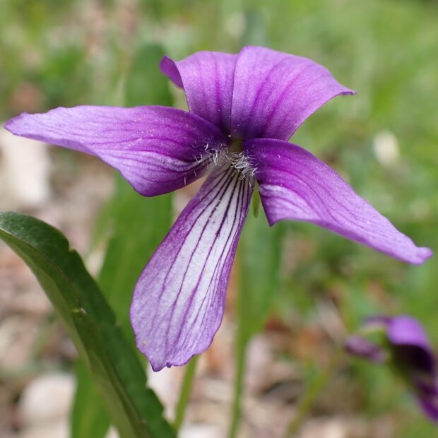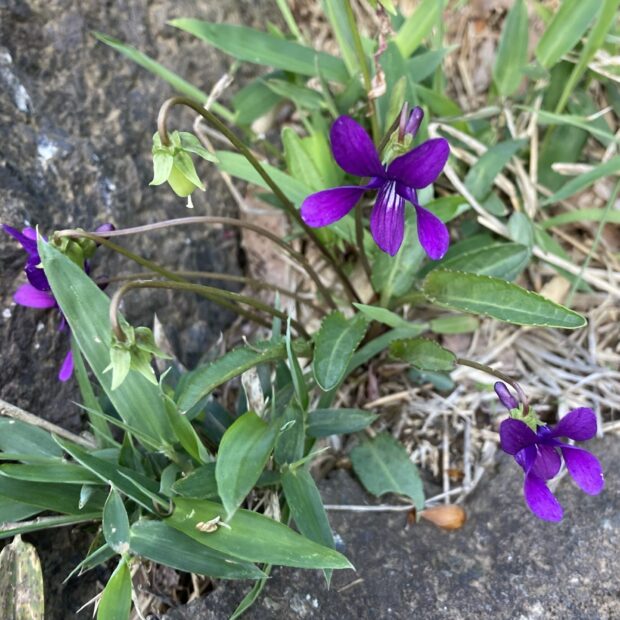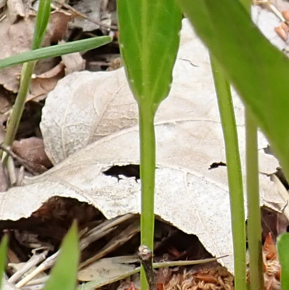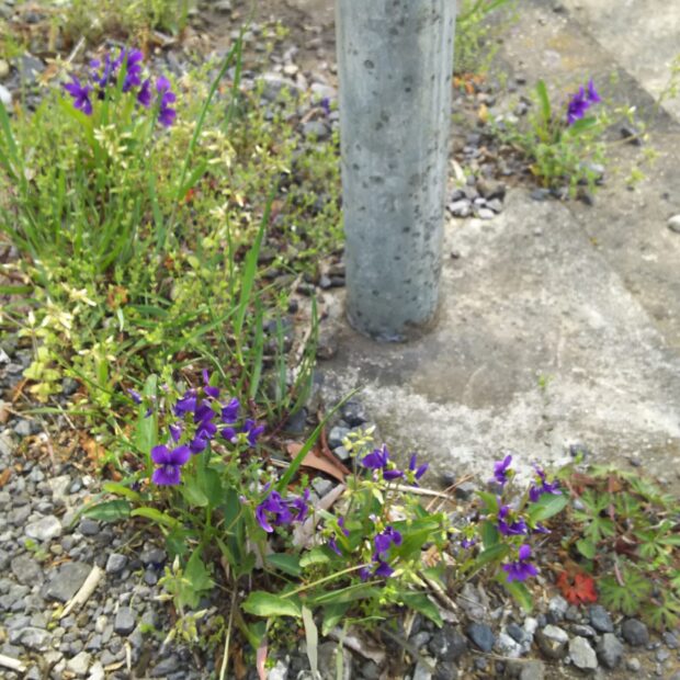 茎があるかないかは、 スミレ類を見分ける最初の分岐点です。 藤色のタチツボスミレは地上に茎を出しますが、 スミレは地上に茎がなく、 花も葉も直接地面から出ます。