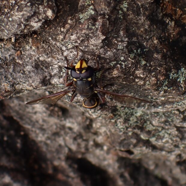 姿も飛び方もドロバチにそっくりなハナアブ。 体は黒色で、 腰は細くくびれ、 腹部には2本の黄色い帯があります。 成虫はクヌギ、 シイ、 カシなどの樹液に集まり、 樹皮の下に産卵します。