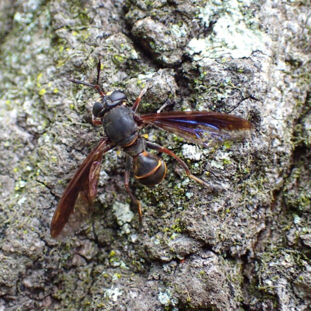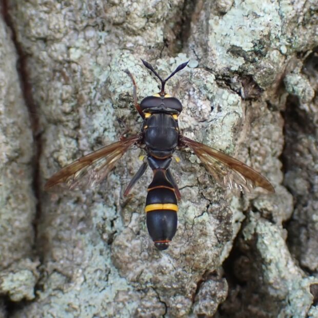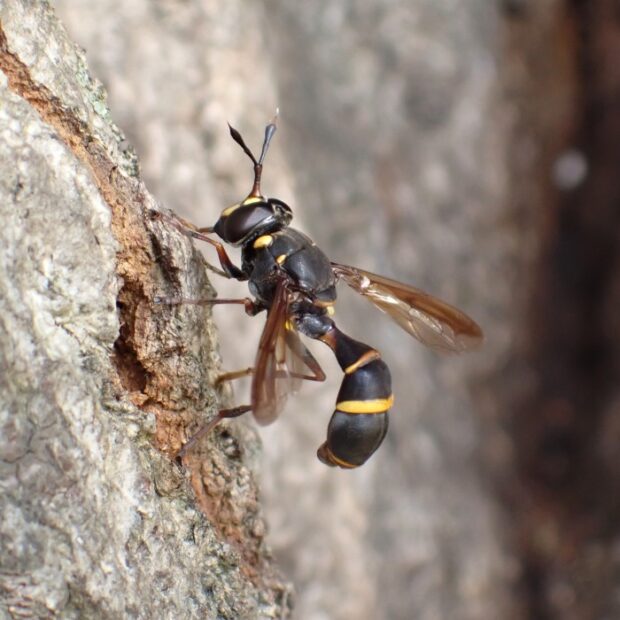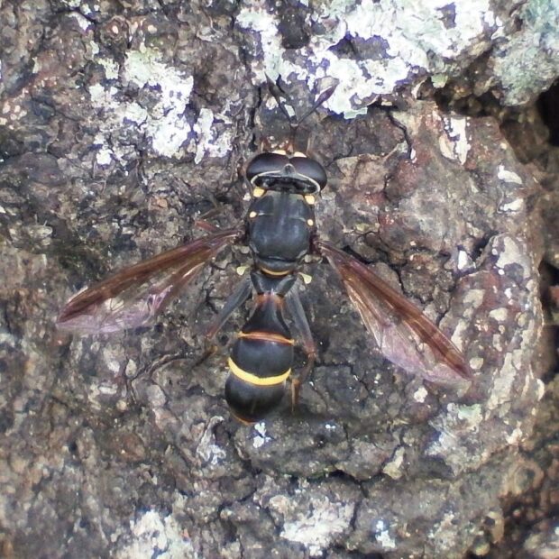 姿も飛び方もドロバチにそっくりなハナアブ。 体は黒色で、 腰は細くくびれ、 腹部には2本の黄色い帯があります。 成虫はクヌギ、 シイ、 カシなどの樹液に集まり、 樹皮の下に産卵します。