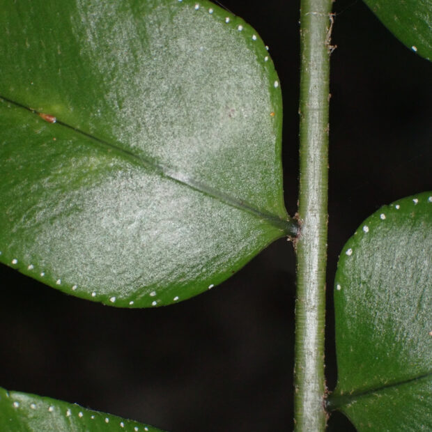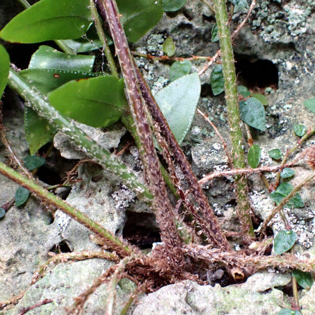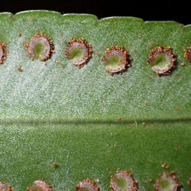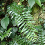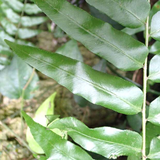 主に明るい斜面に群生する南方系のシダです。 人里近くでもよく大きくて長い葉をたらしていて、 その姿が伝説の鳥「鳳凰(ほうおう)」の尾に例えられました。 貫衆(かんじゆう)はヤブソテツの意味があります。 若葉は「宮古ぜんまい」といわれ、 宮古島などでは食用にもされます。