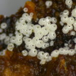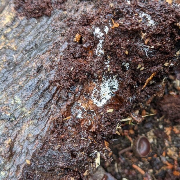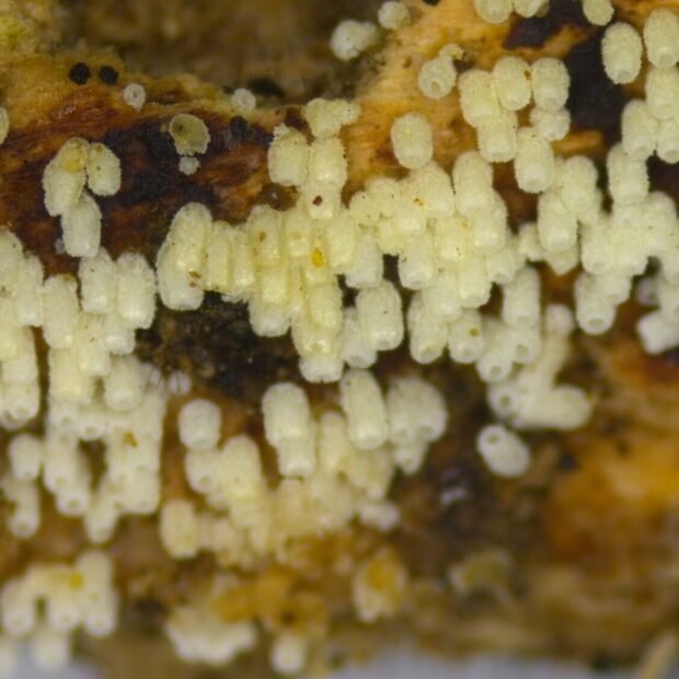 枯れ木の裏側に生えているので最初は見つけにくいですが、 大量発生してびっしりと覆うことがしばしばあります。 ルーペがあればパイプの形をしているのが分かるので、 ぜひ身近な木をひっくり返して探してみてください。