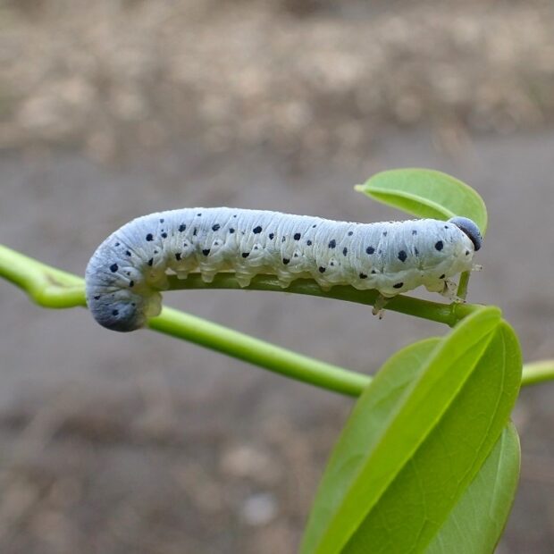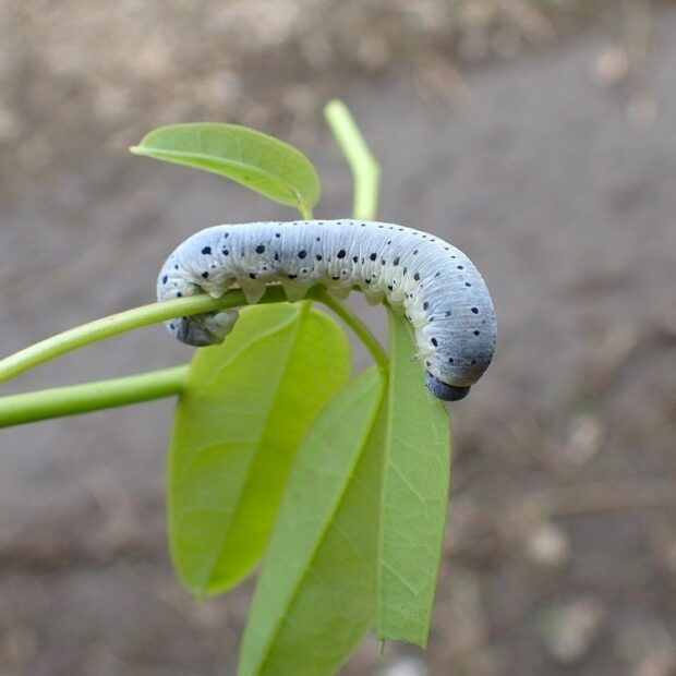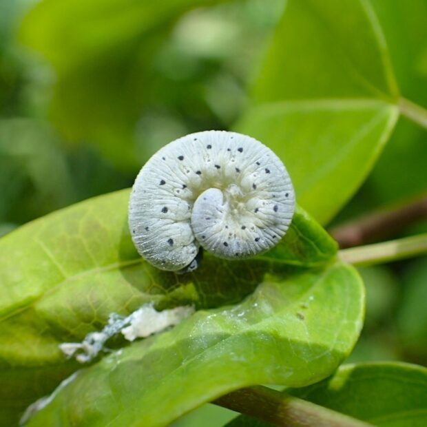 幼虫がアケビの葉を食べるコンボウハバチの仲間。 春に見られ、 頭や胸の周りに毛が生えています。 コンボウハバチの仲間は、 体が太く、 触角がこん棒状です。 (MT)